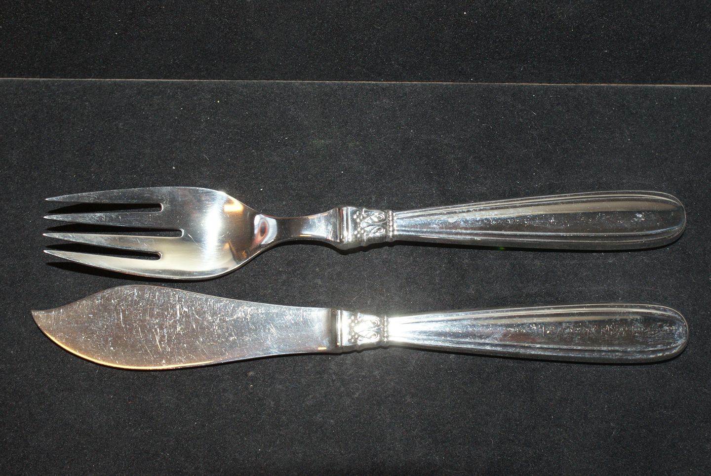 Fish cutlery set Karina Silver Horsens silver Fork length 19,2 cm. Knife length 19.5 cm. Used and well maintained. All cutlery is polished and packed in a bag