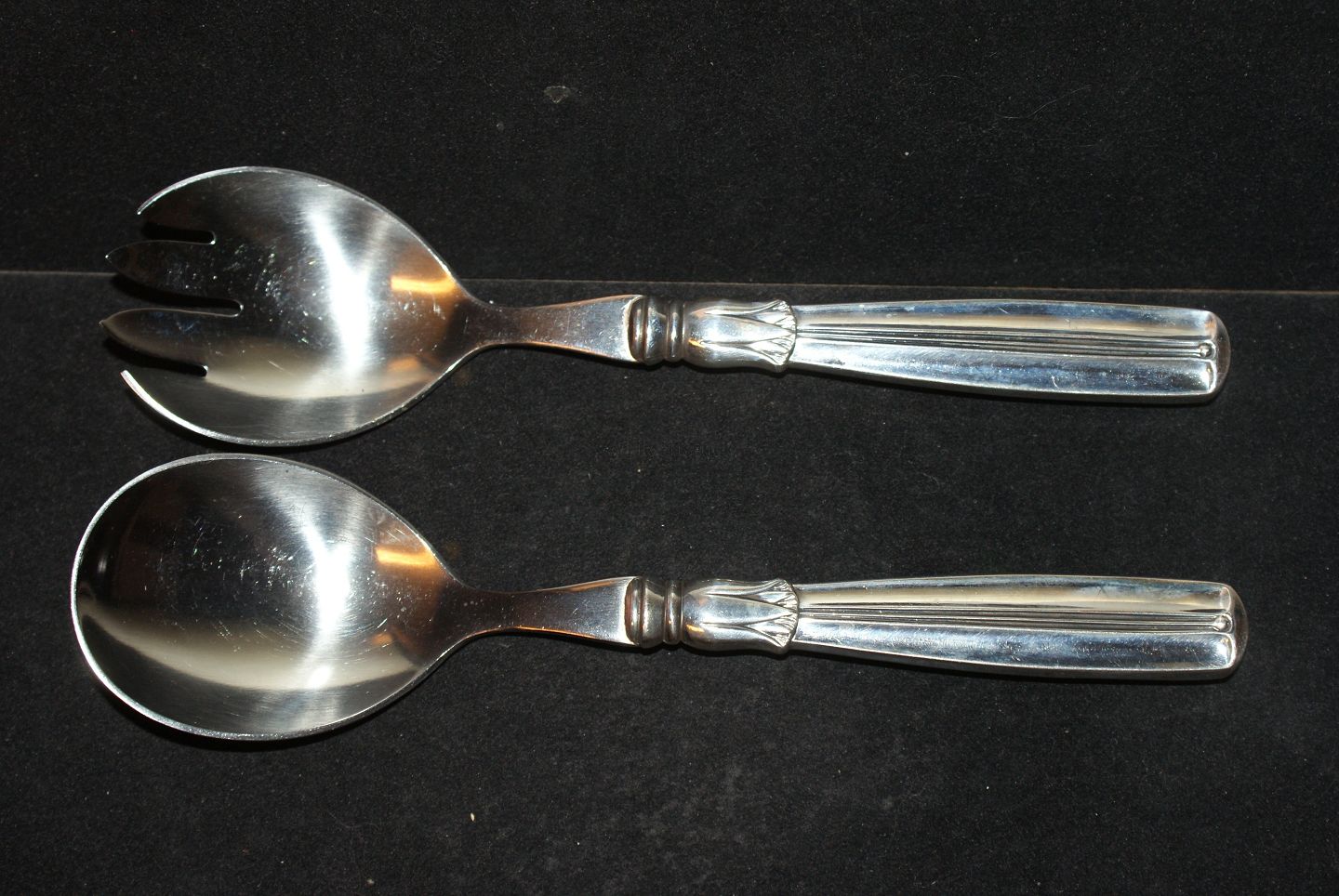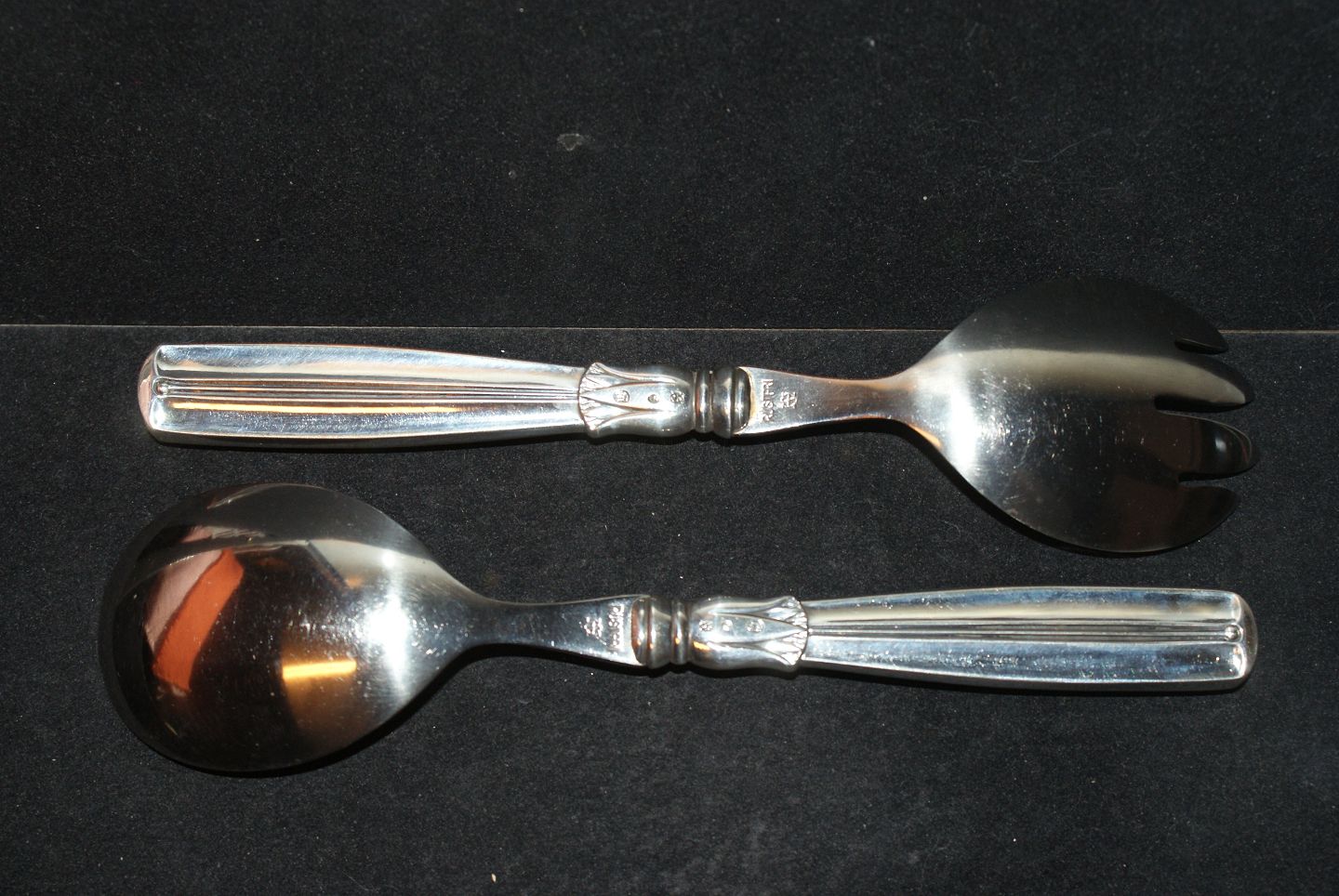 Salad Cutlery Set Lotus Silver W & S Sørensen Length 18 cm. Used and well maintained. All cutlery is polished and packed in a bag