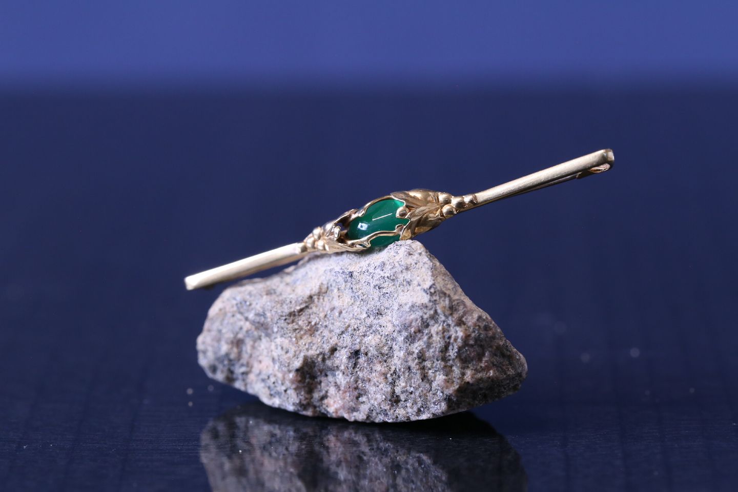 This very special and unique gold brooch will complete any outfit with style and elegance. The beautiful green stone, surrounded by a beautiful pattern of gold, gives this brooch both dynamics and life.