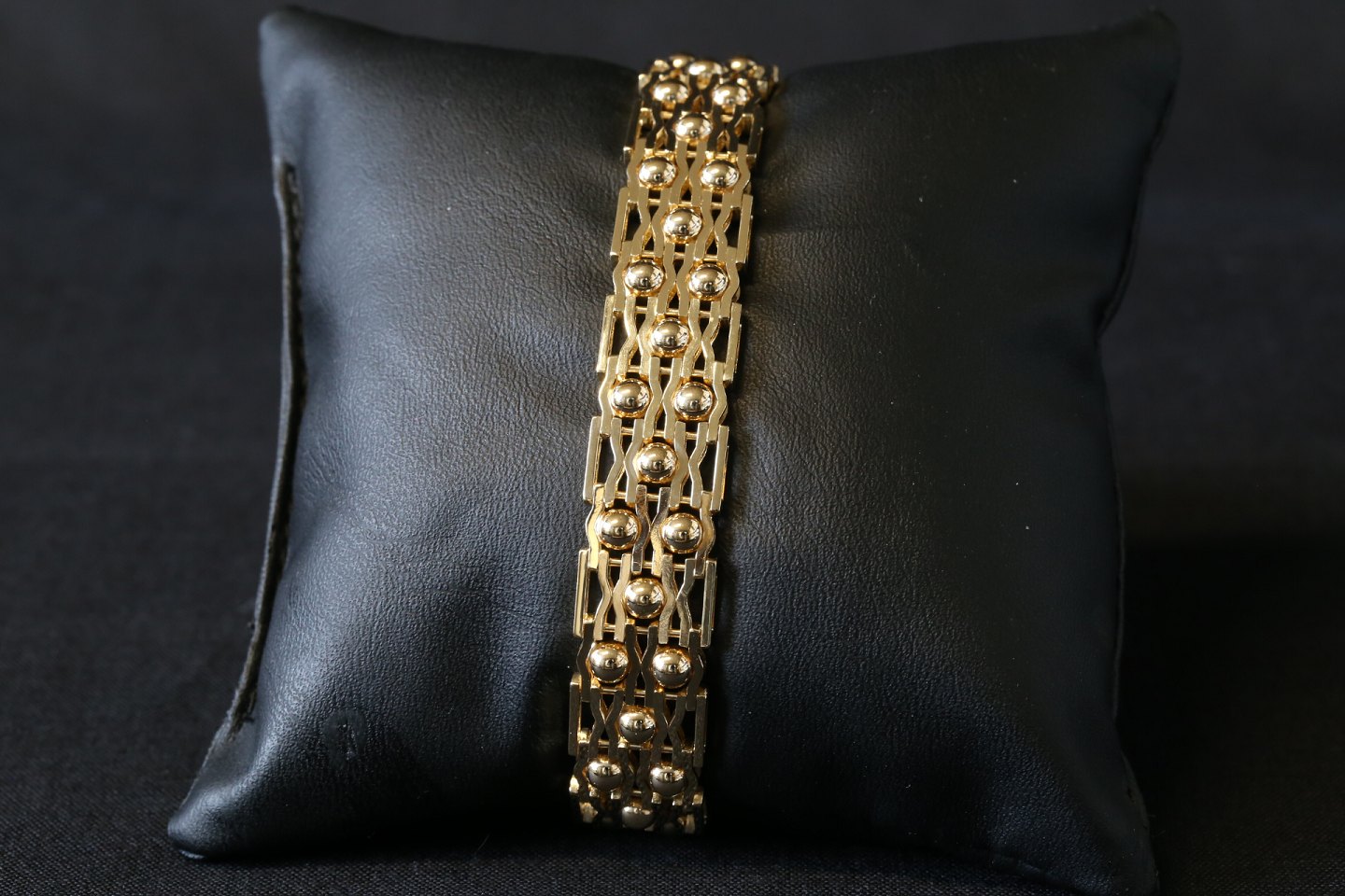 Gold bracelet in solid 14 carat gold, and with a nice pattern in the chain. The fine details bring the bracelet to life. Gold balls are inlaid in the links, which helps to make this chain extra elegant.