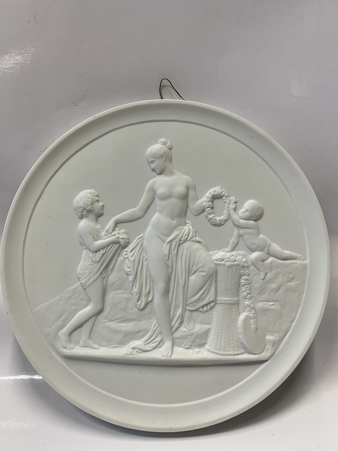 Royal Copenhagen Bisquit plate by Thorvaldsen "Childhood and Spring." Stamped "Royal Copenhagen ENERET". 1st grade. Measures 14 cm. Neat and well maintained.