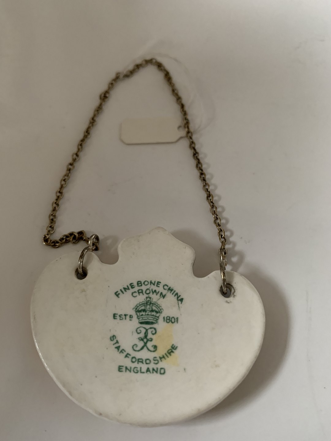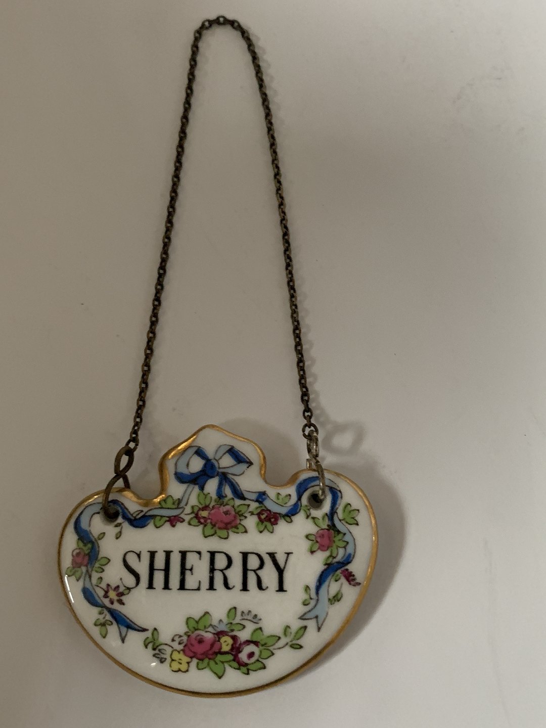 Flaske / Karaffel Sherry skilt med kæde Stemplet Stafford Shine England Størrelse 5,3 x 4,2 cm. Flot og velholdt stand