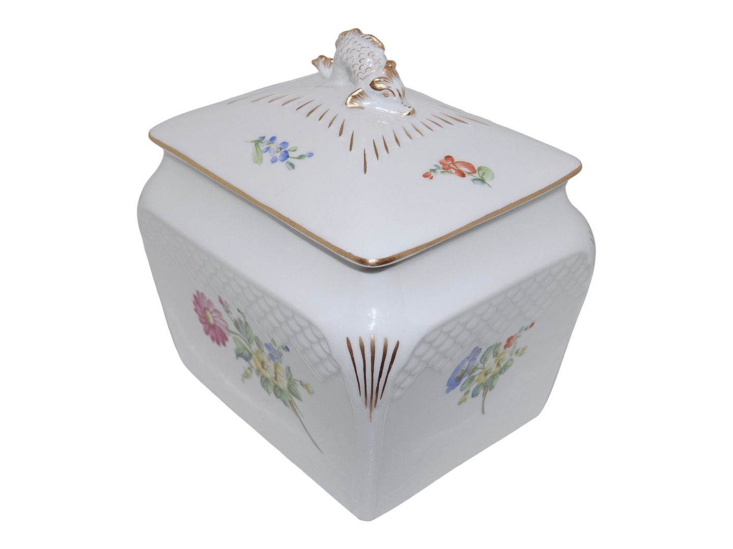 Bing & Grøndahl Saksisk Blomst på hvidt porcelæn, kiksespand. Dekorationsnummer 77. Denne er produceret mellem 1948 og 1952. 1. sortering. Længde 15,2 cm., højde 16,0 cm. Perfekt stand uden fejl.
