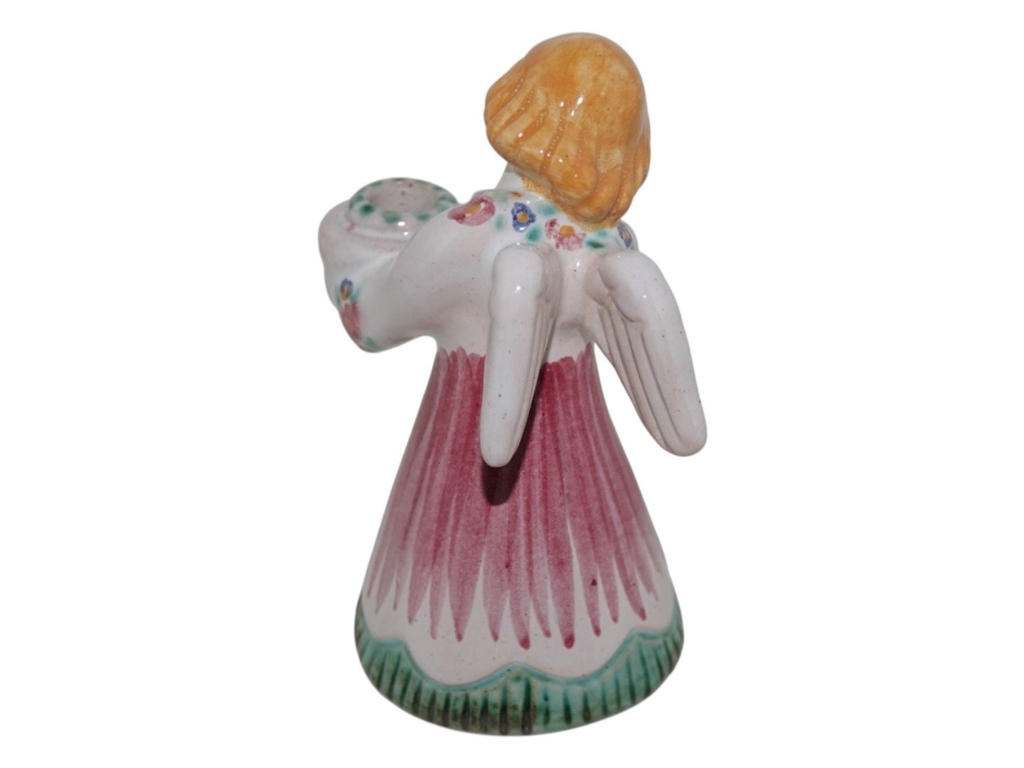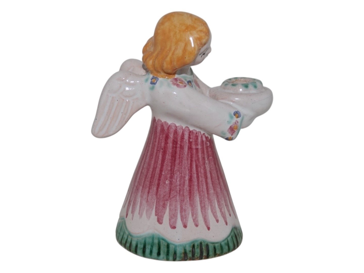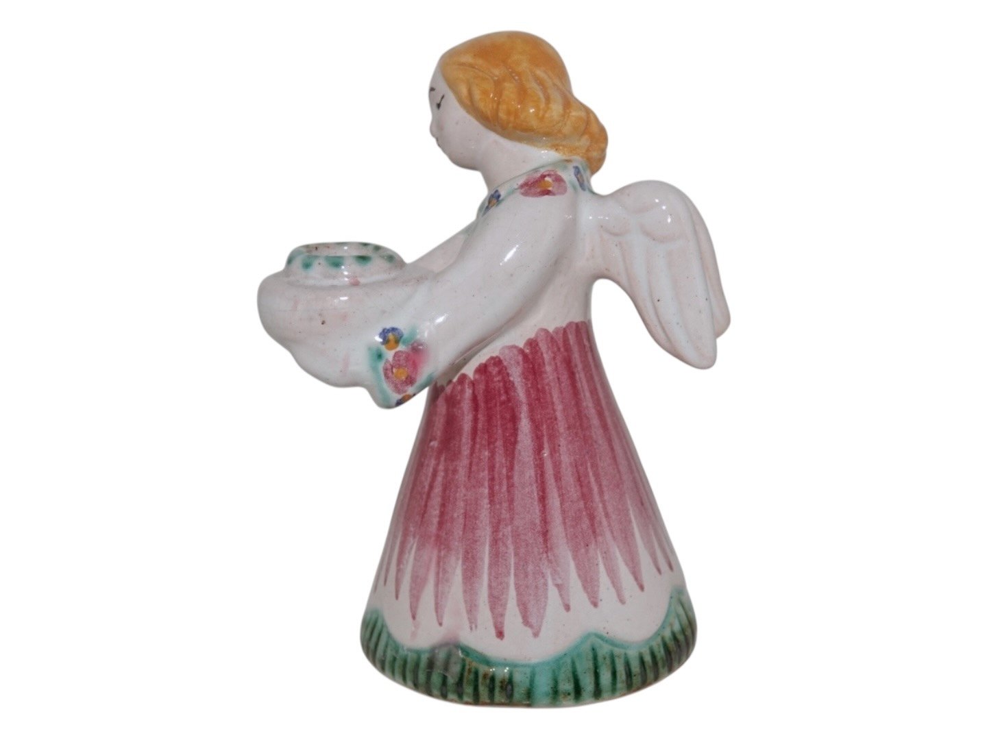 Hjorth Keramik, engel figur / lysestage med rød, grøn og gul dekoration.