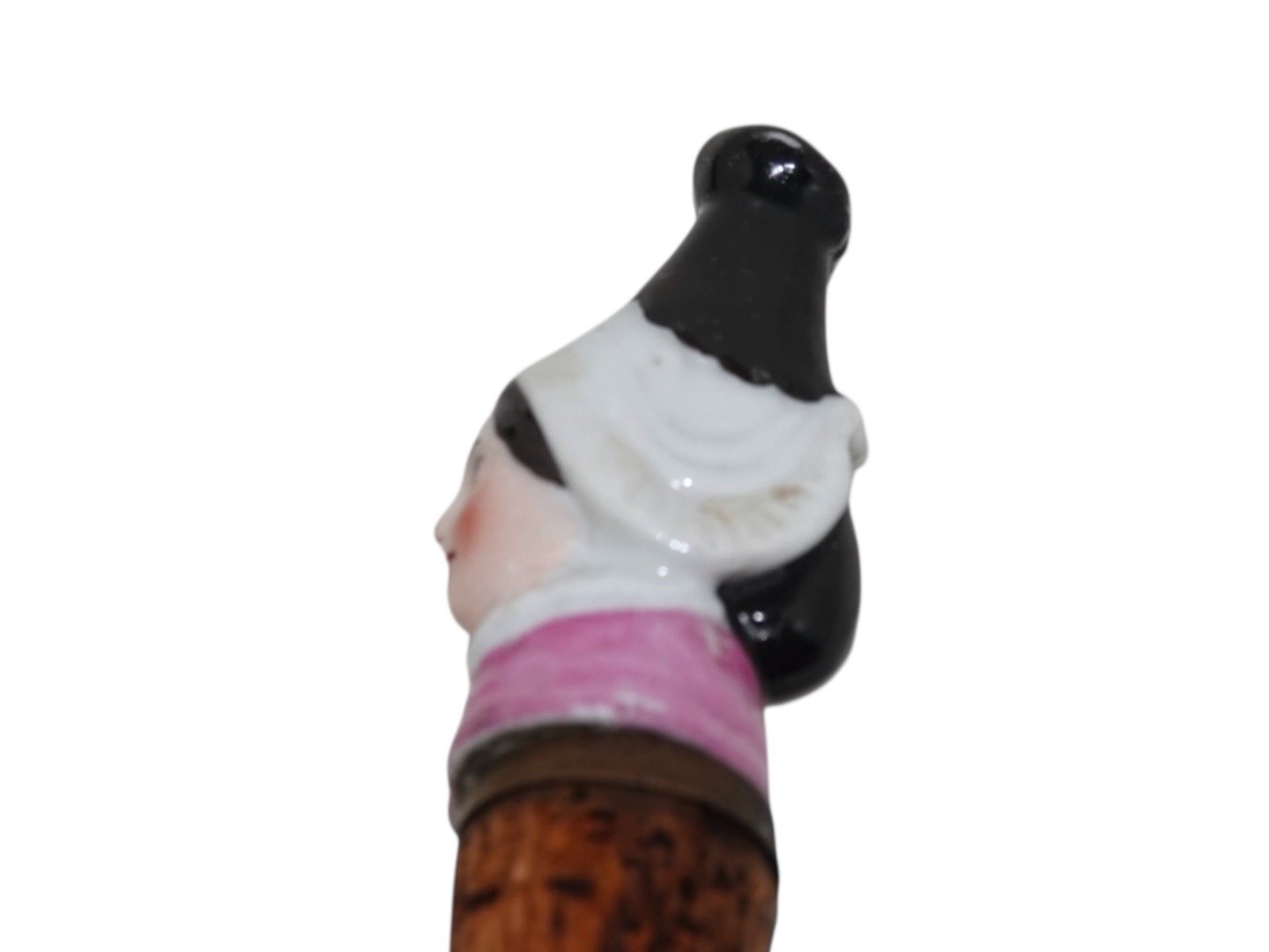 Flaskeprop af dame fra ca. år 1890-1900. Længde 8,5 cm. inklusiv kork. Der er en gammel reparation/skår, se fotos.