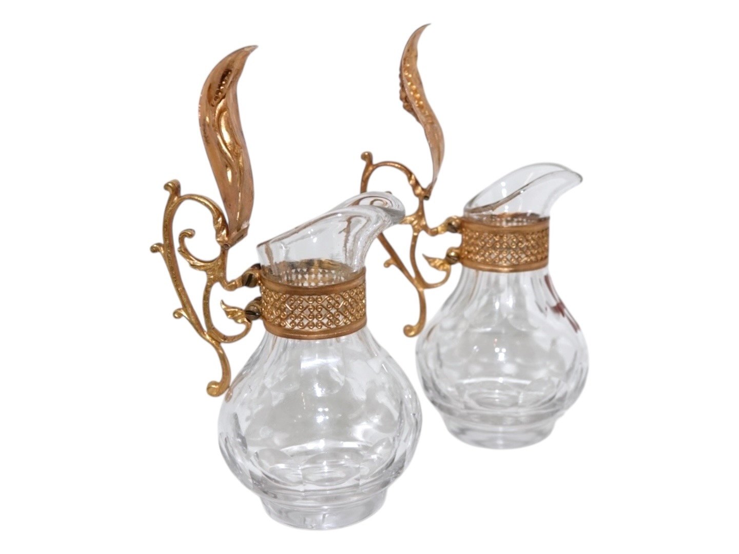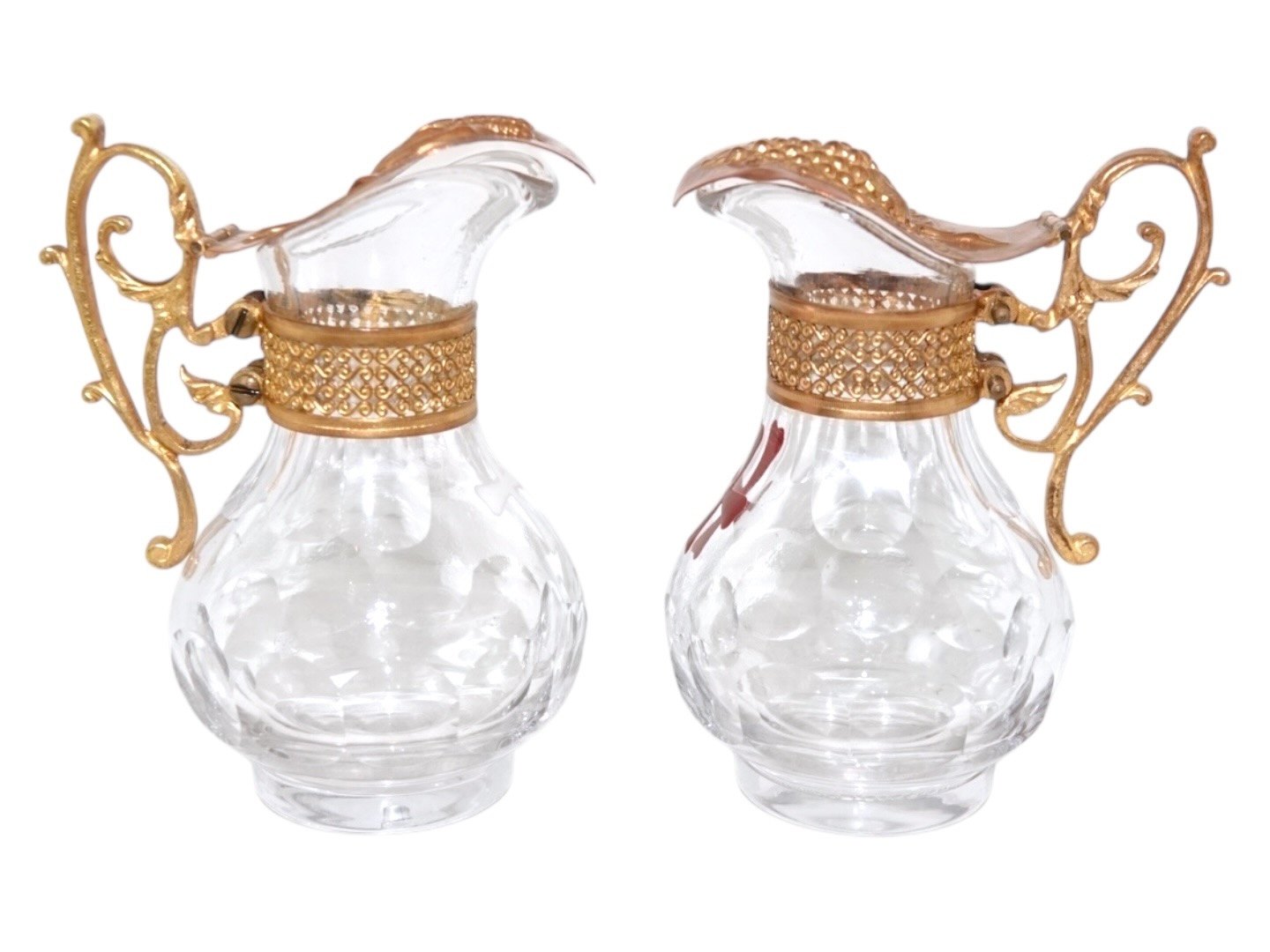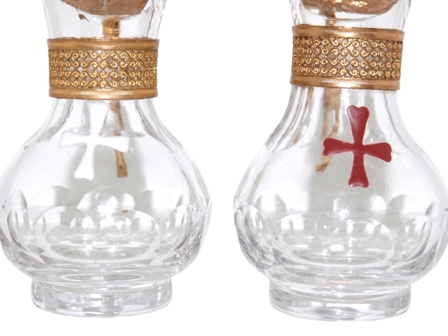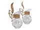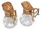 Et par små glaskander med bronze låg og dekoreret med henholdsvis et rødt og hvidt emalje kors. Der er fra omkring år 1900. Højde 10,5 cm. Fin og velholdt stand uden fejl. Prisen er for begge.