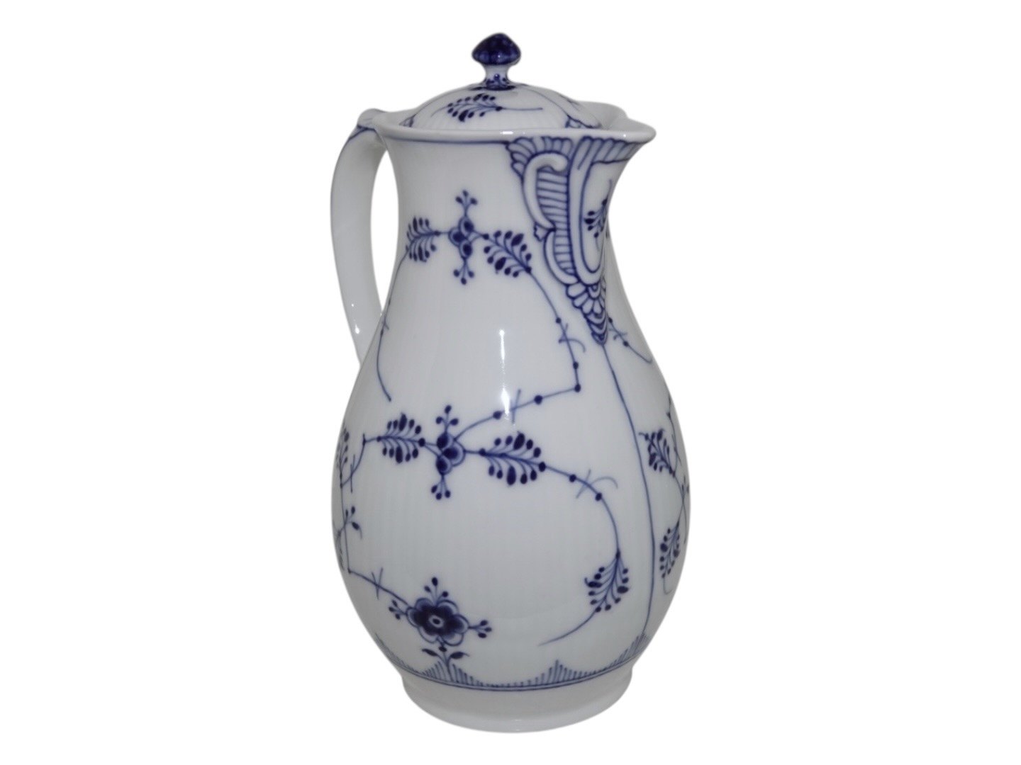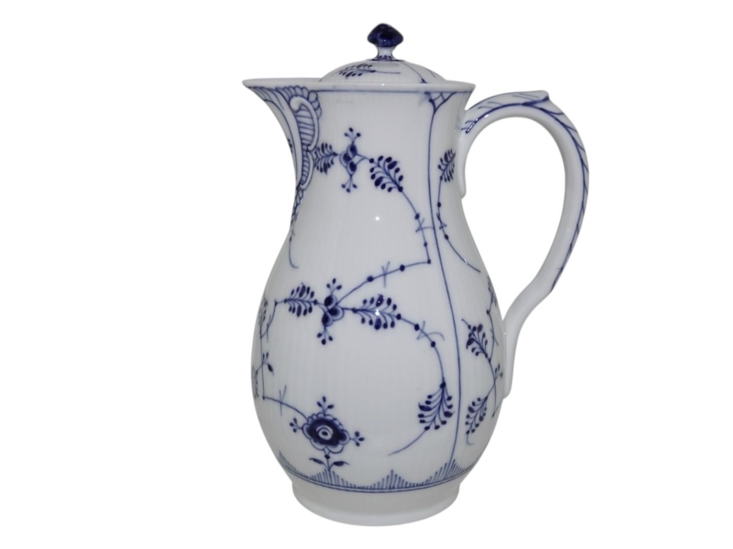 Royal Copenhagen Musselmalet Riflet, sjælden chokoladekande med tilhørende låg.