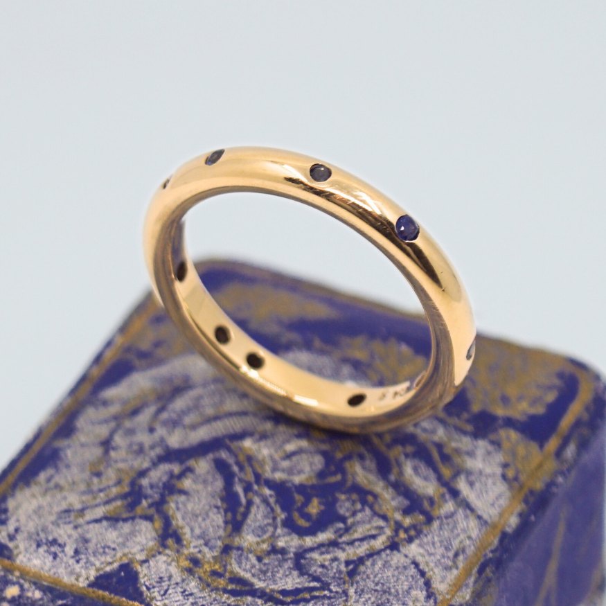 Carl Antonsen; Ring i 14 kt. guld, prydet med safirer Ring str. 58. Stemplet "CA 585".