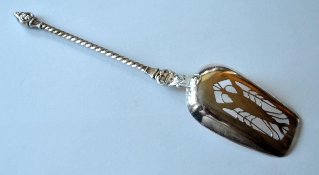 Krebse ske af sølv, København, 1869. Uidentificerbar mester stempel. Med byvåben og guardein mærke. Laf med krebs og indvendig forgyldning. Snoet skæft med englehoved. L: 22 cm.