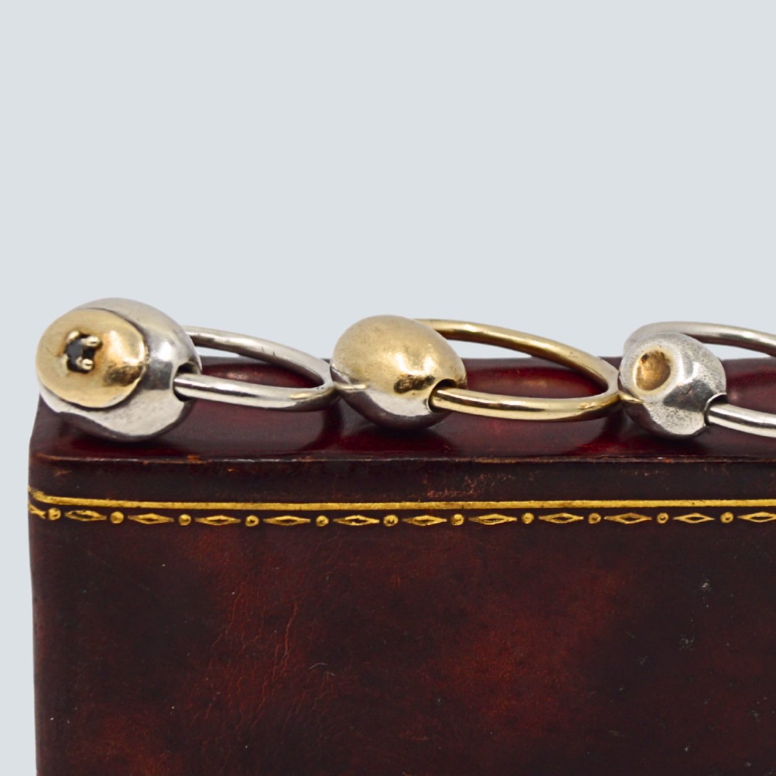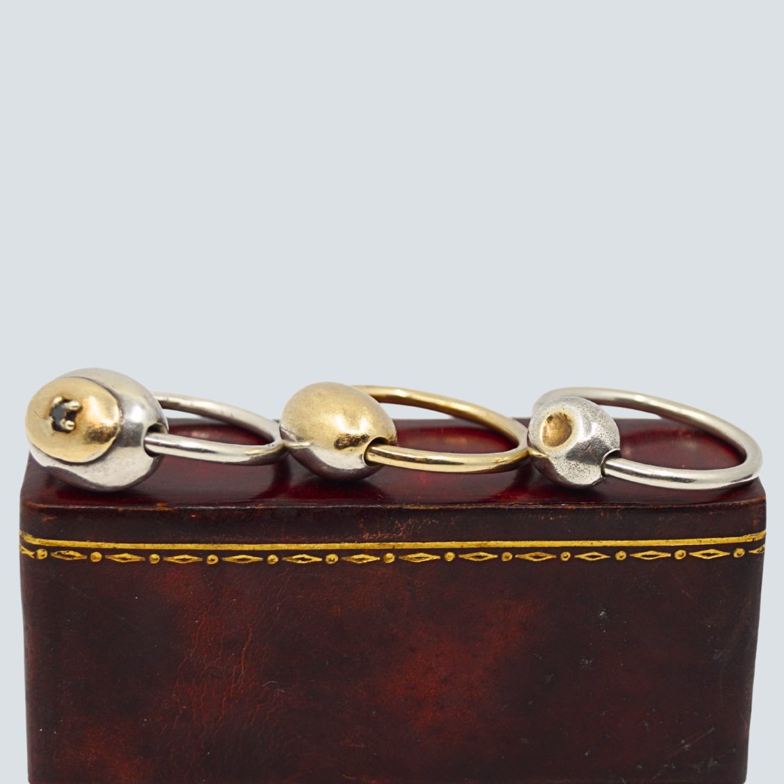 | Anette Kræn; Sæt af tre fingerring af sølv prydet med guld. En prydet med guld og safir. Indvendig dia. 2,5 cm.