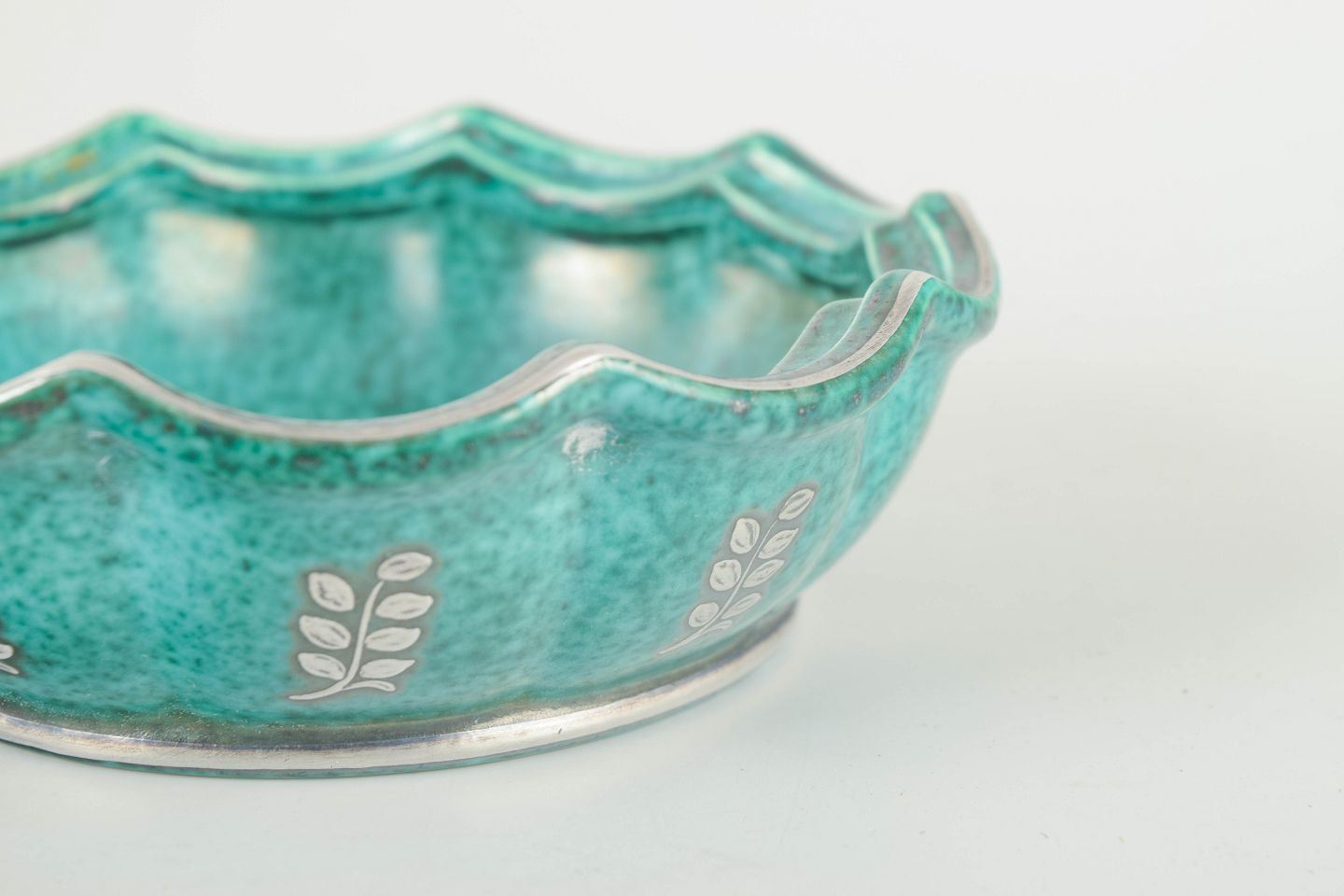 Lav rund skål i turkisglaseret stentøj med indlagte sølvdekorationer langs siderne og i bunden. Let bølget, formpresset rand.