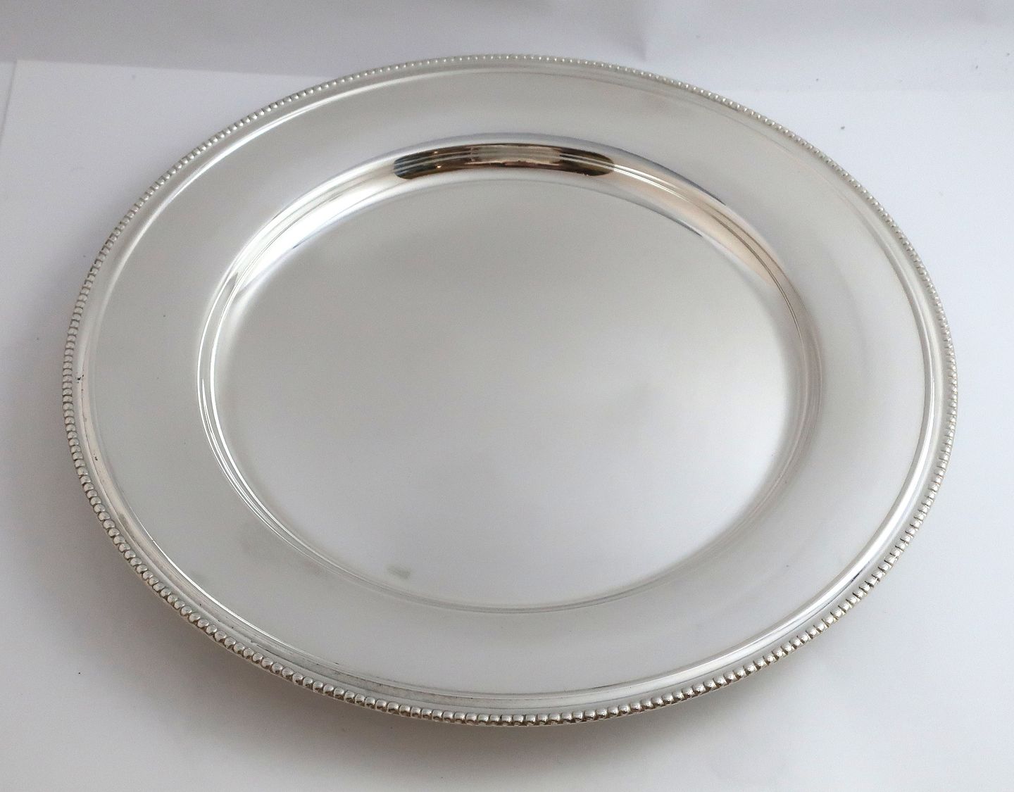 12 styk sølvplet dækketallerkner med perlekant. Diameter 28 cm. Brugsspor på et par stykker.