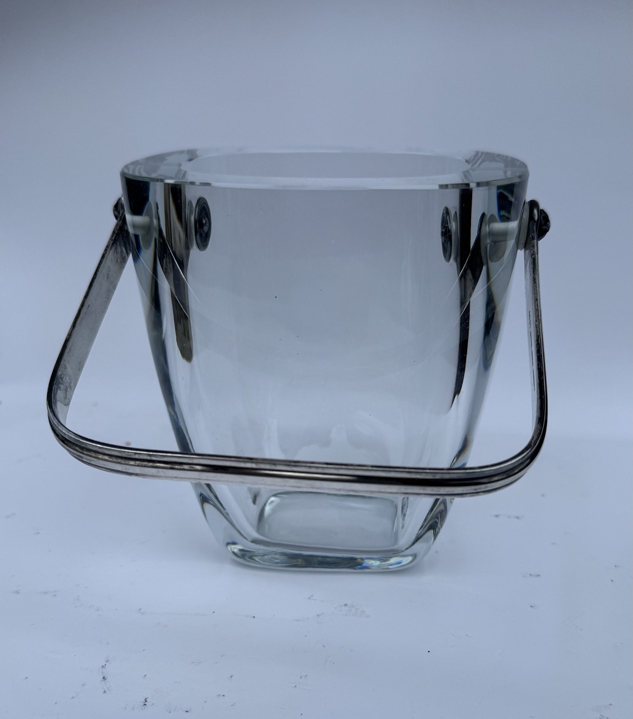 Isspand i glas fra svenske Strömbergshytten med greb i sterling sølv af E. Dragsted. I god stand.