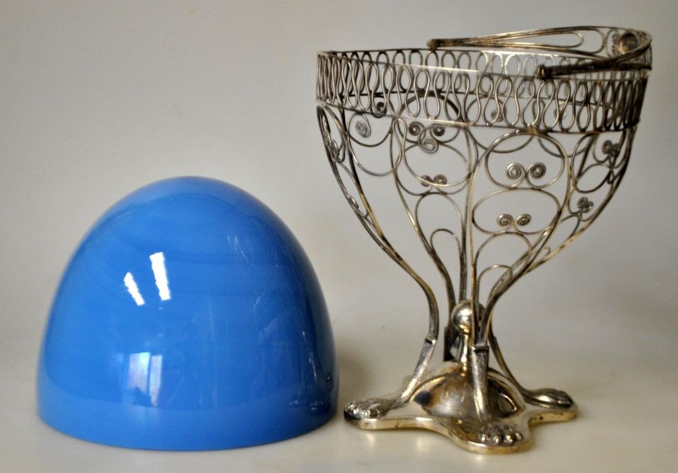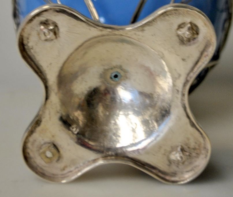 Jacob Wilhelm Ryder (1787 - 1853) København, Danmark: Stor sukker kumme. 18.. Empire. Med lysblåt glas indsats. Med hank.   Filigranarbejde. Stemplet med mestermærke, byvåben, guardein mærke og månedmærke. H.. 16 cm. Højde med hank: 21,5 cm. Vægt sølv: 158 gram.