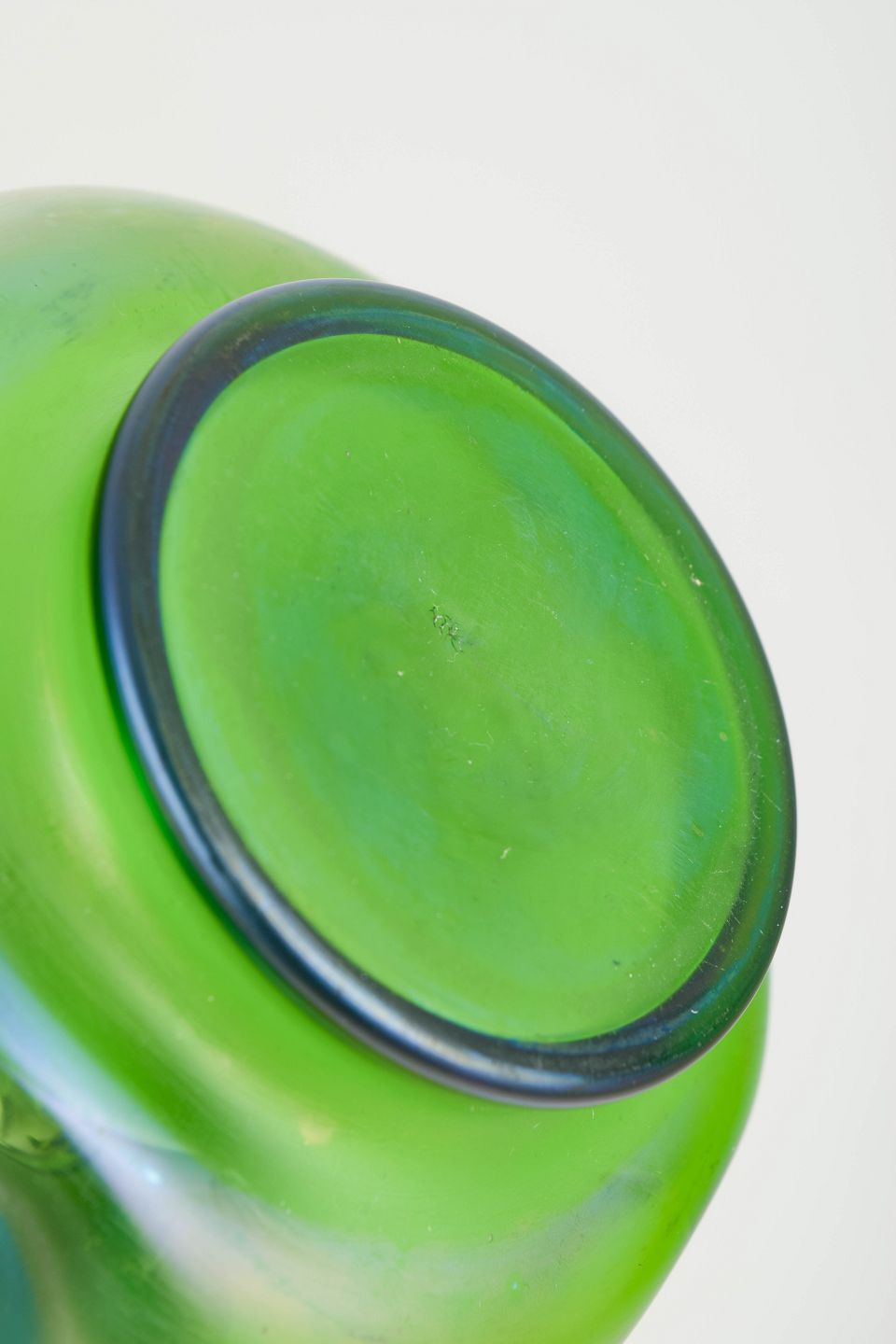 Art Nouveau-vase i iriserende kunstglas med klar grøn grundtone og blødt afrundede, organiske former. Lav og bred bug med let indtrukket hals, afsluttet med dekorativ tinmontering udført i et stiliseret, naturinspireret motiv. Overfladen viser et diskret farvespil med blålige nuancer mod foden, karakteristisk for perioden.