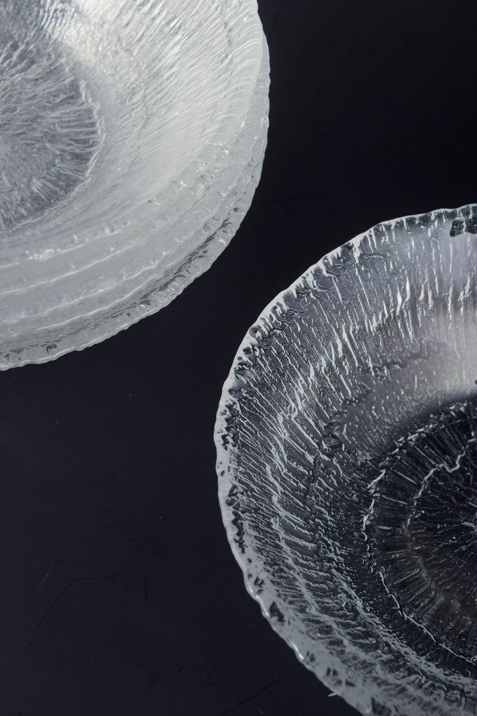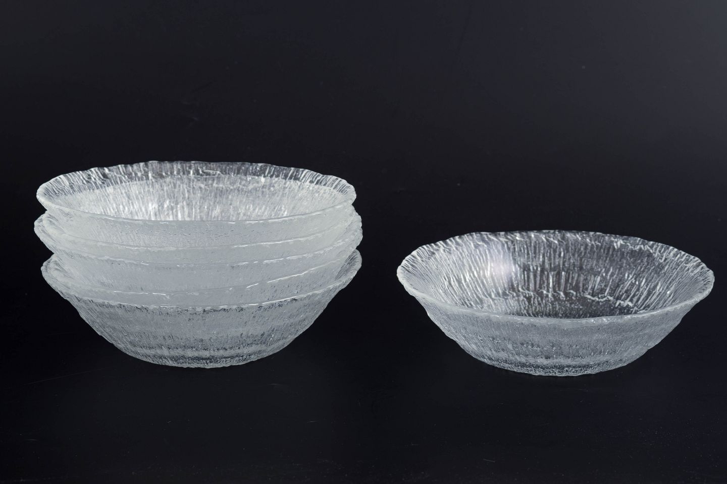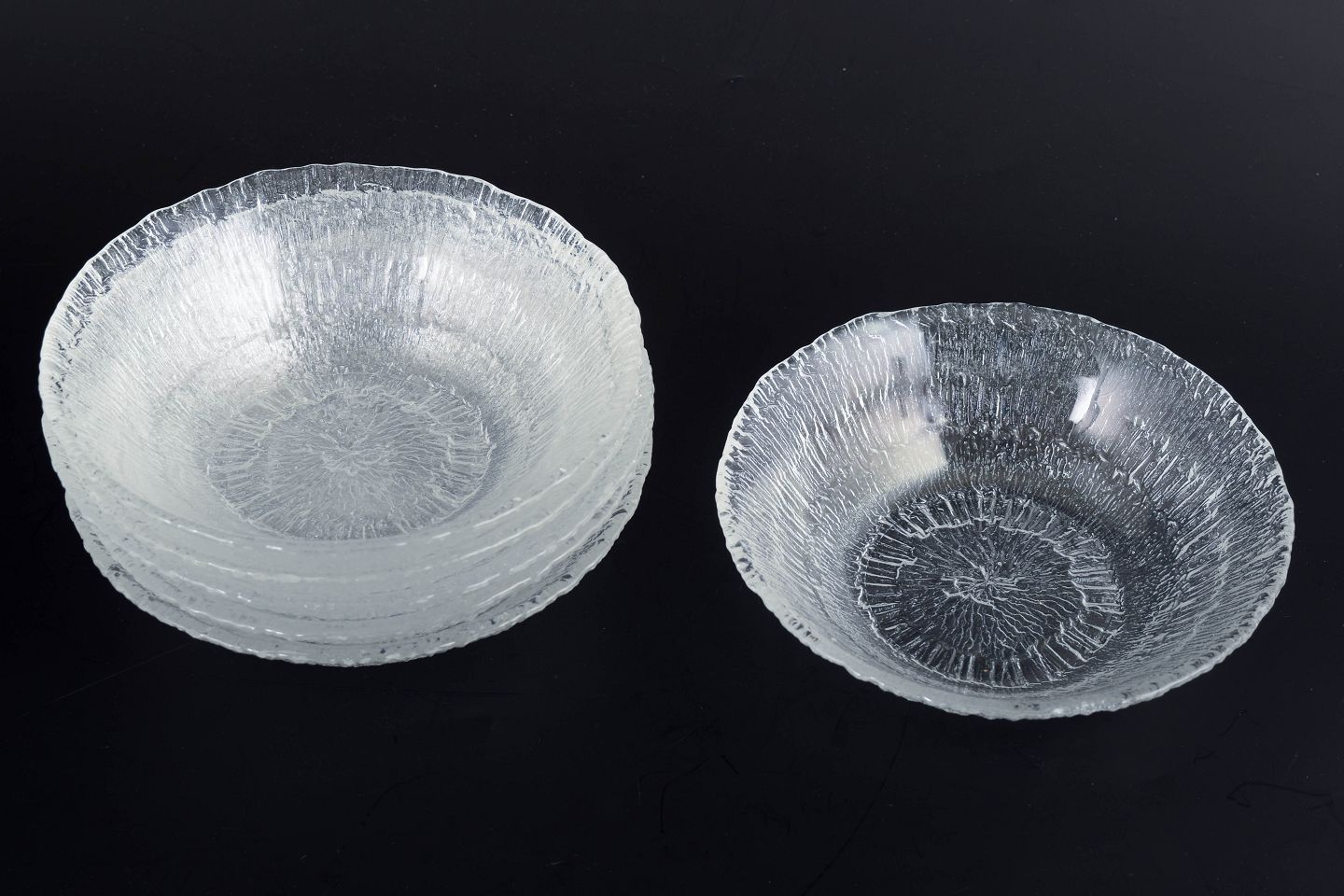 Sæt på seks skåle i presset klart glas fra serien Ultima Thule, kendetegnet ved den karakteristiske, strukturerede overflade inspireret af smeltende is og nordisk natur. Uden mærkning.