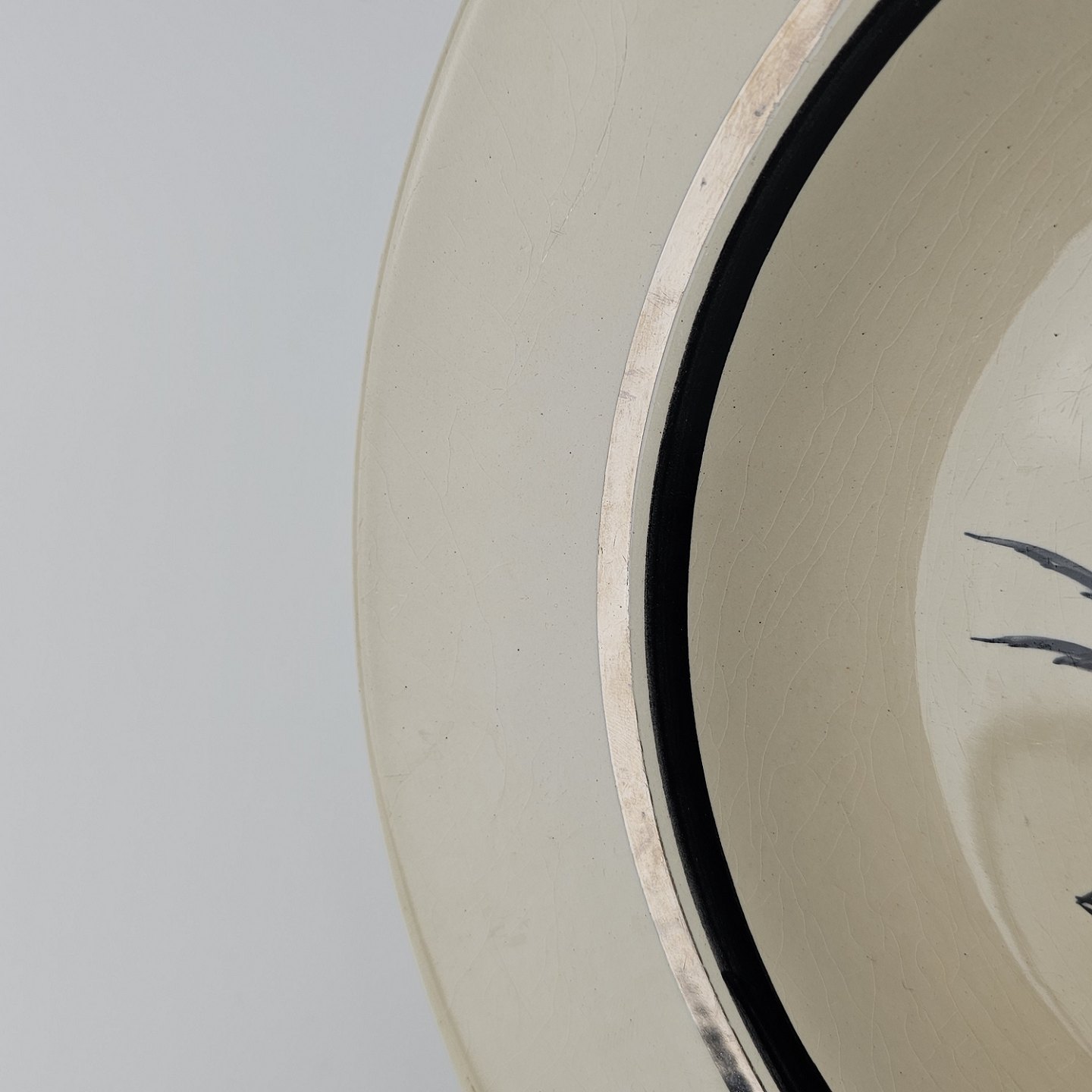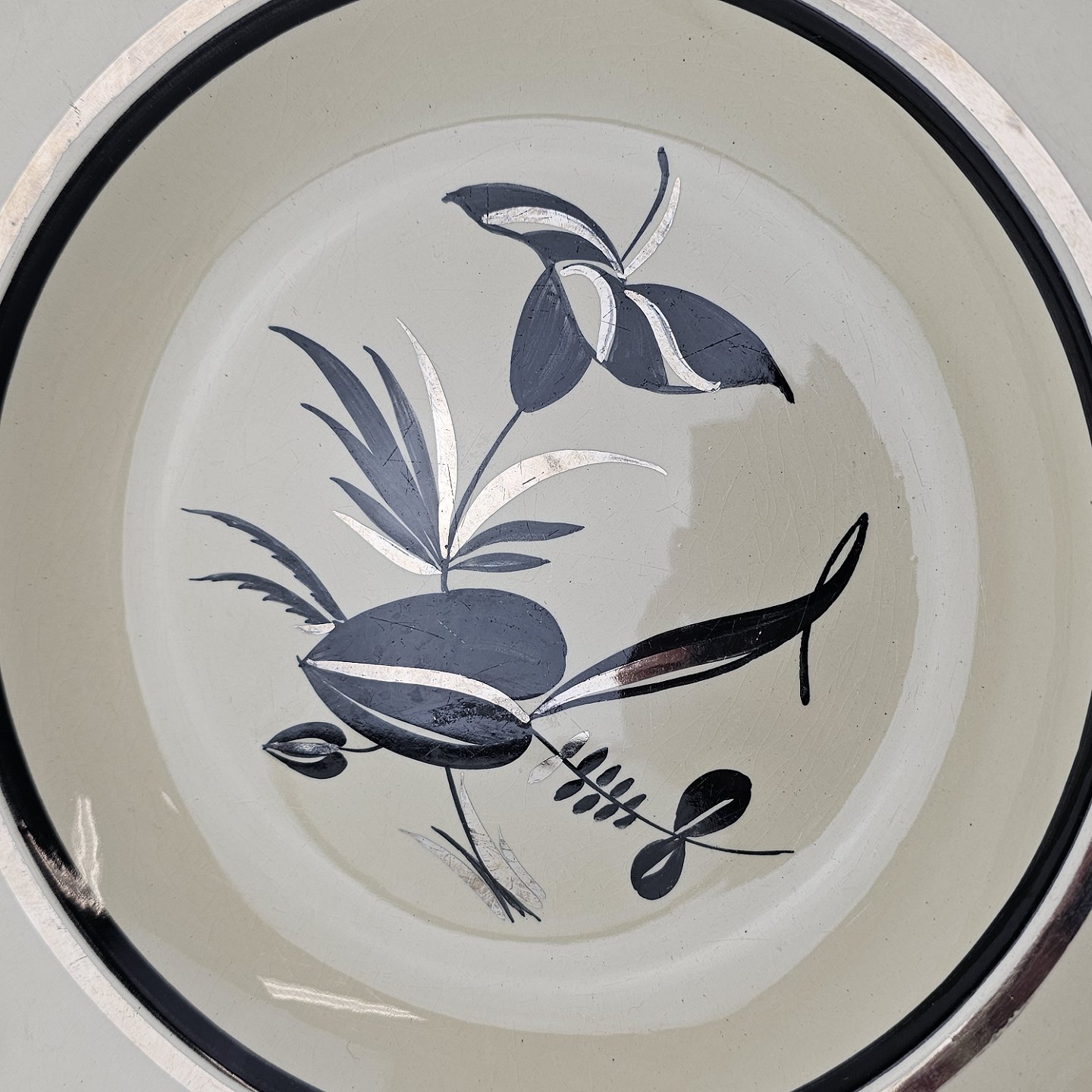 Råhvidt fajancestel i stelform E med dekoration af naturmotiver i sølv og sort farve.