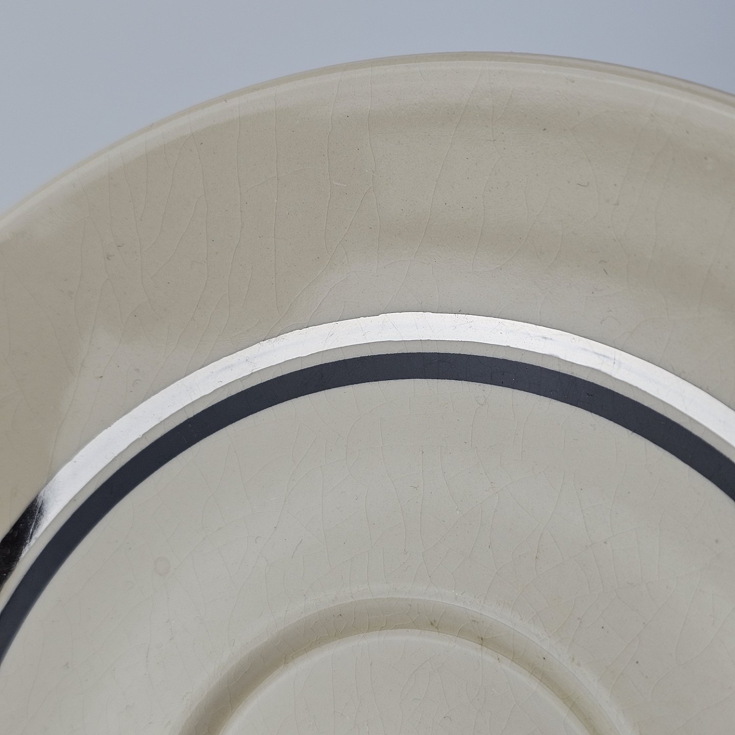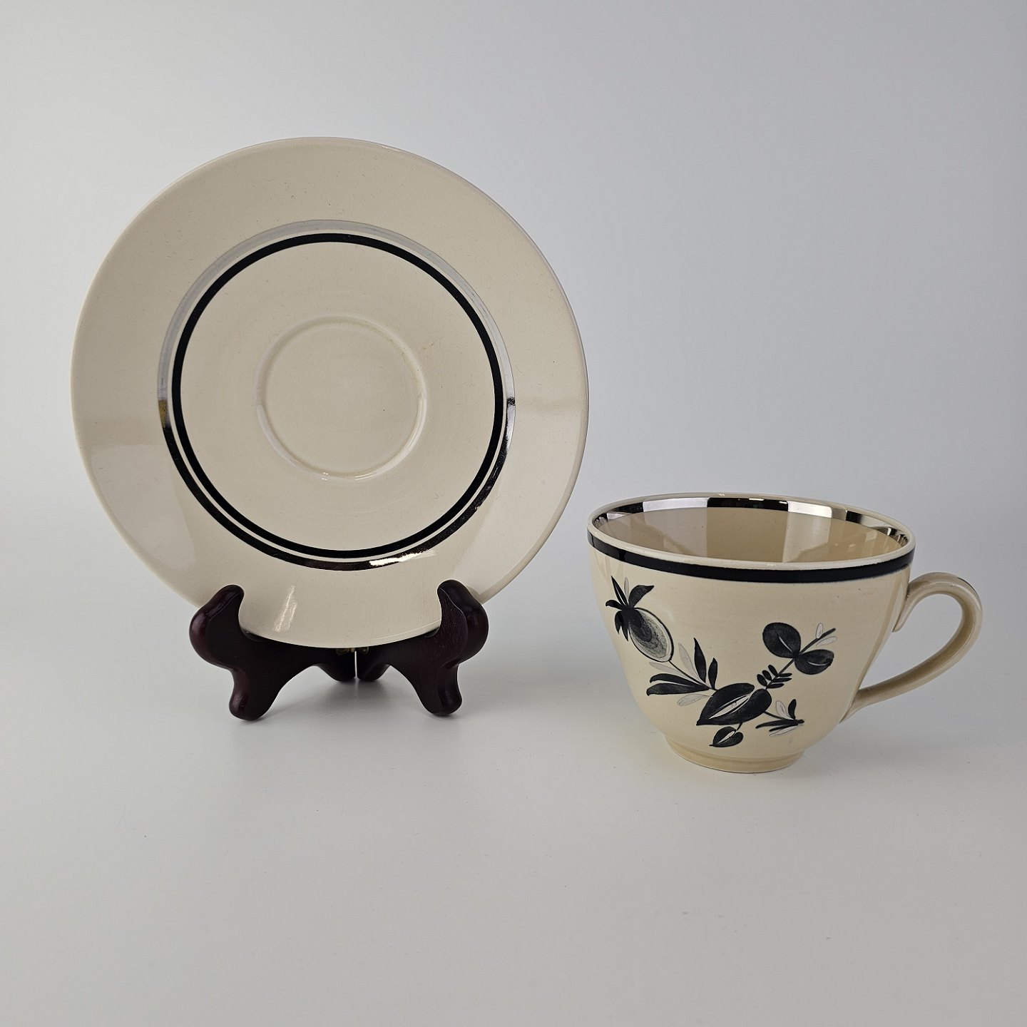 Råhvidt fajancestel i stelform E med dekoration af naturmotiver i sølv og sort farve.