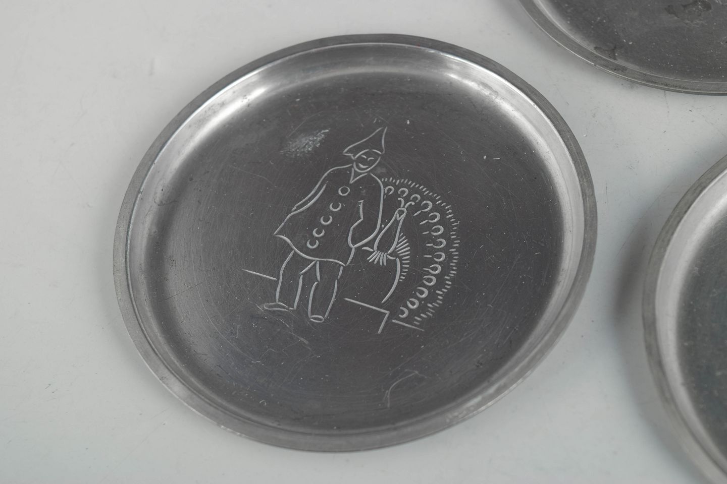 Sæt af seks flaskeunderlag i tin med indgraverede københavnermotiver i et dekorativt art deco formsprog. Model 2387.