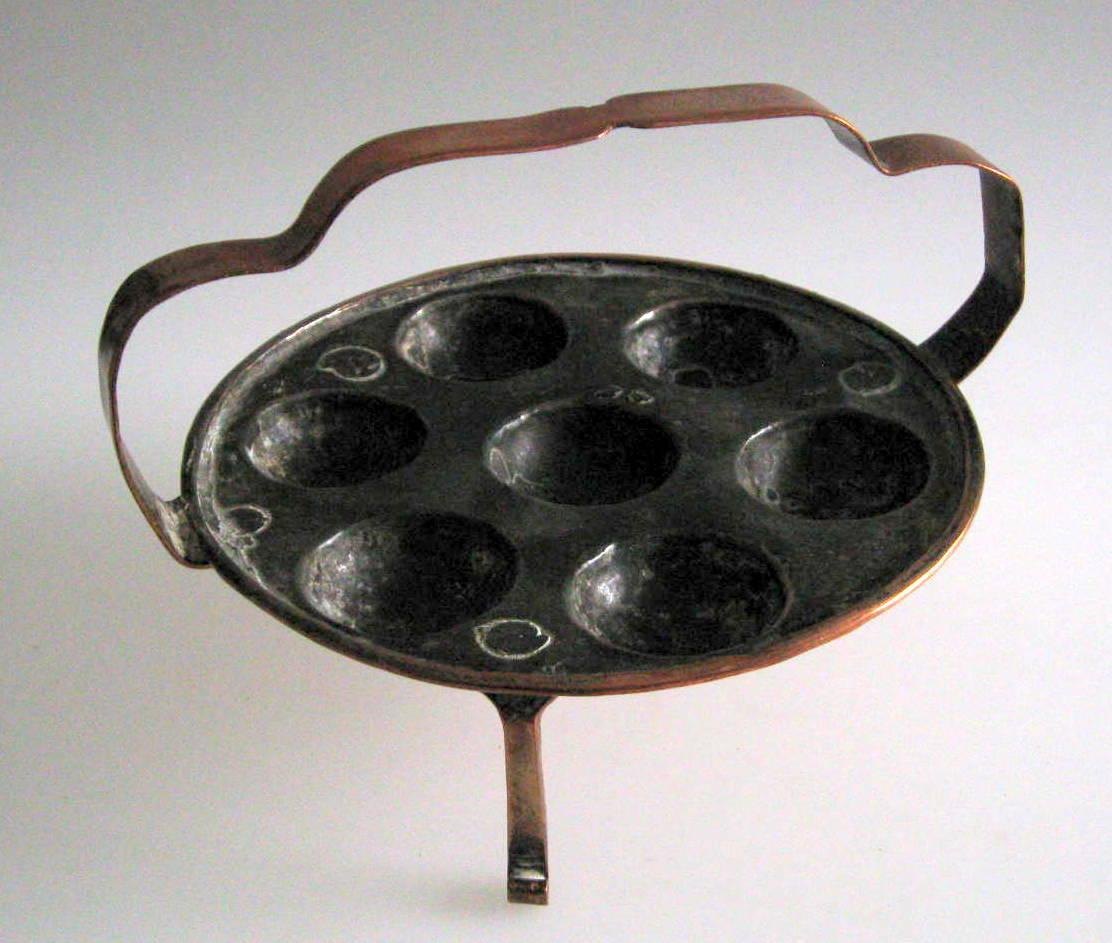 Antik æbleskivepande i kobber, 1842. På trefod med hank. Til 7 æbleskiver. Indvendig fortinnet. På hanken følgende inskription: Ane Haldner 1842. Proveniens: Sønderjysk familie.