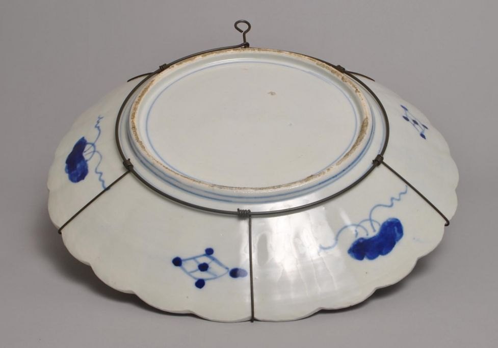 Stort Imari fad, 19. årh. Japan. Med bølget rand. Polykrom dekoration og forgyldning med fugle og blomster. Dia.: 40 cm.