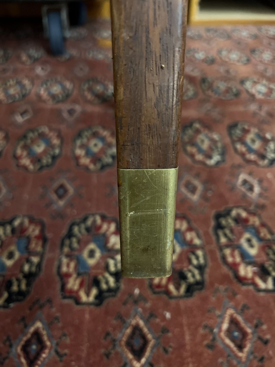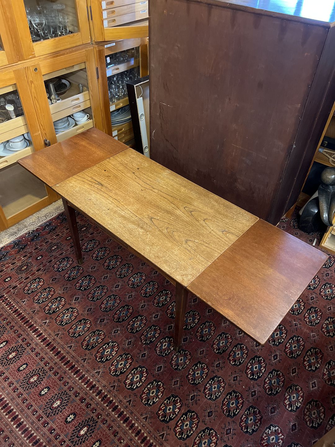 Dansk snedkermester sofabord med udtræk, udført i teak med sko i messing. Produceret ca. 1950'erne. Brugt stand, bør rennoveres.