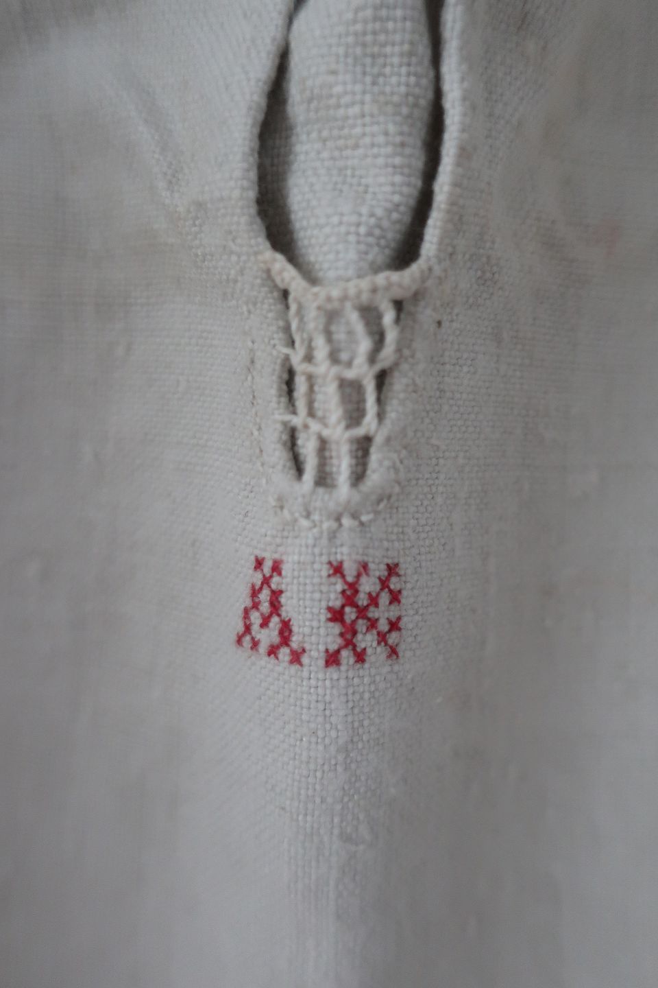 An antique shift ((sewed by hand) with hand made buttons, embroidered hand-made initials to make the dress beautiful