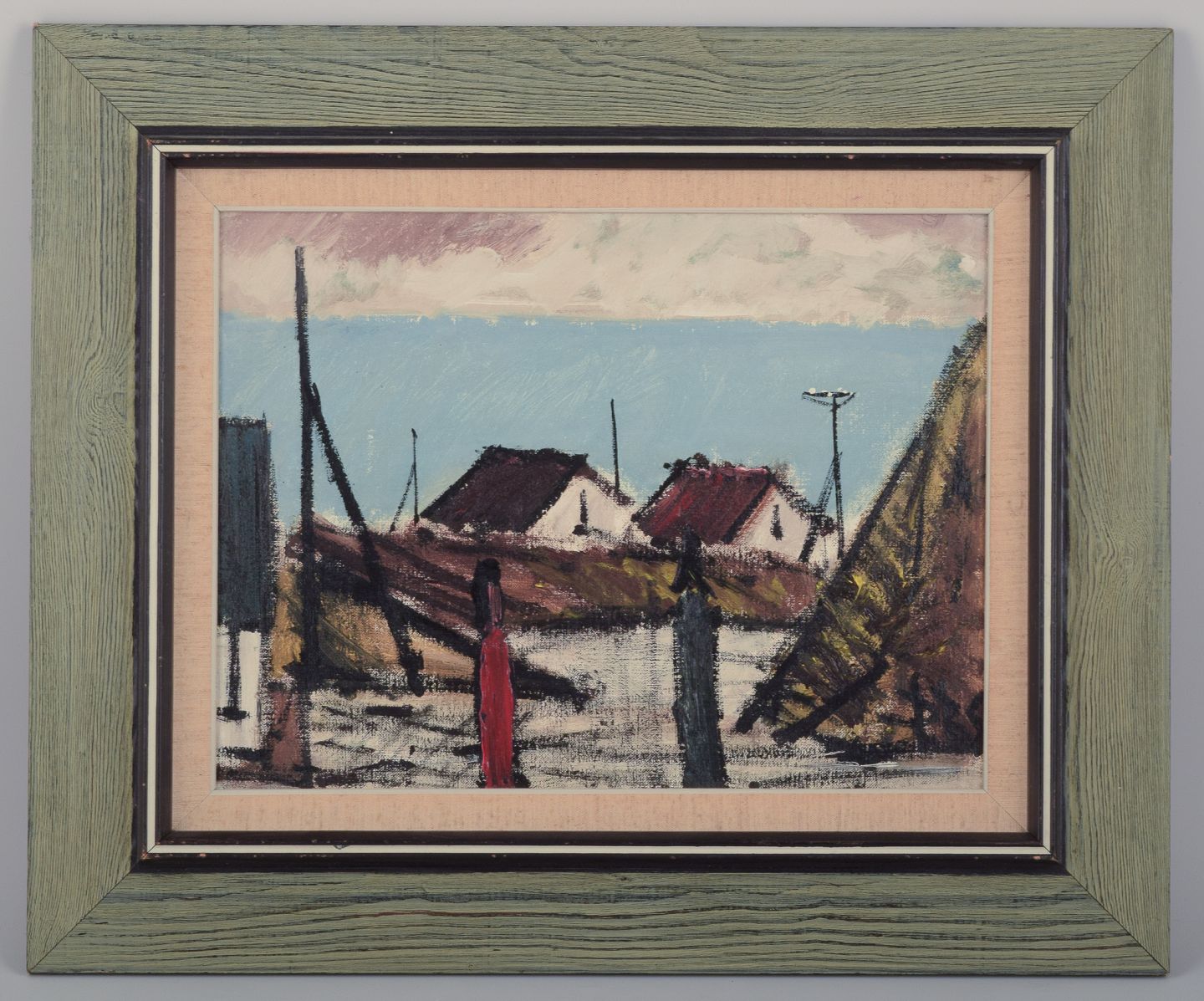 Peder Brøndum Sørensen (1931-2003), Danish painter, oil on canvas. "Figures and Houses by the Sea." Modernist motif.