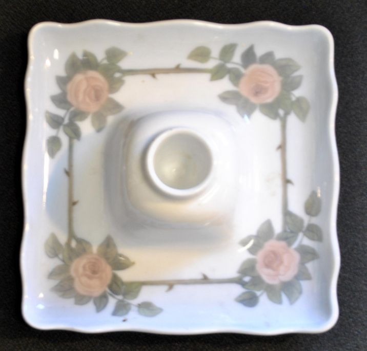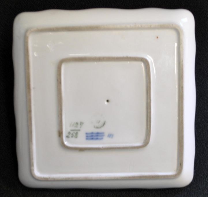 Royal Copenhagen blækhus af porcelæn, 1127/258, 20. årh. København, Danmark. Hvidt porcelæn med lyseblå overmalinger og roser. Bølget kant. H.: 4,6 cm. 15 x 15 cm.