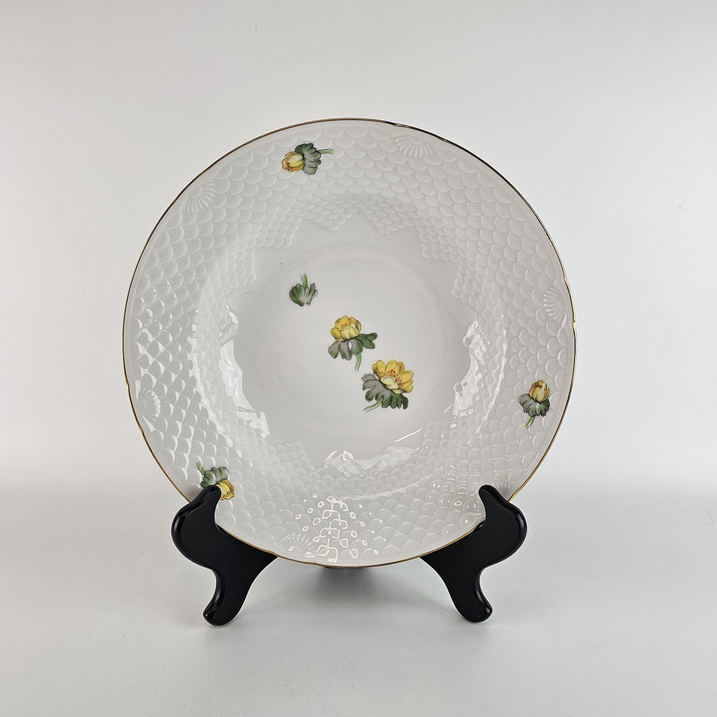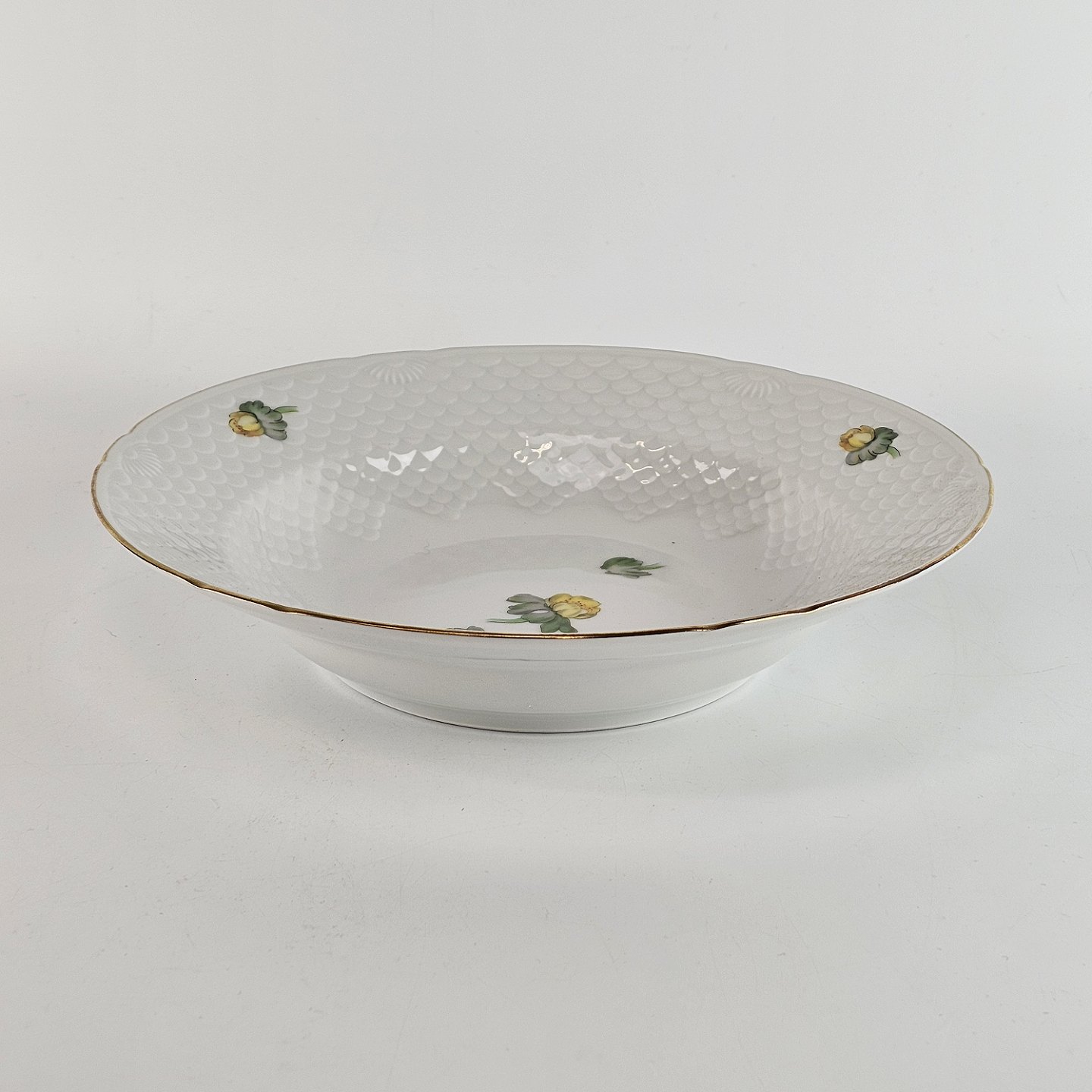 Hvidt porcelæn i skælform med dekoration af gule blomster og guldkant