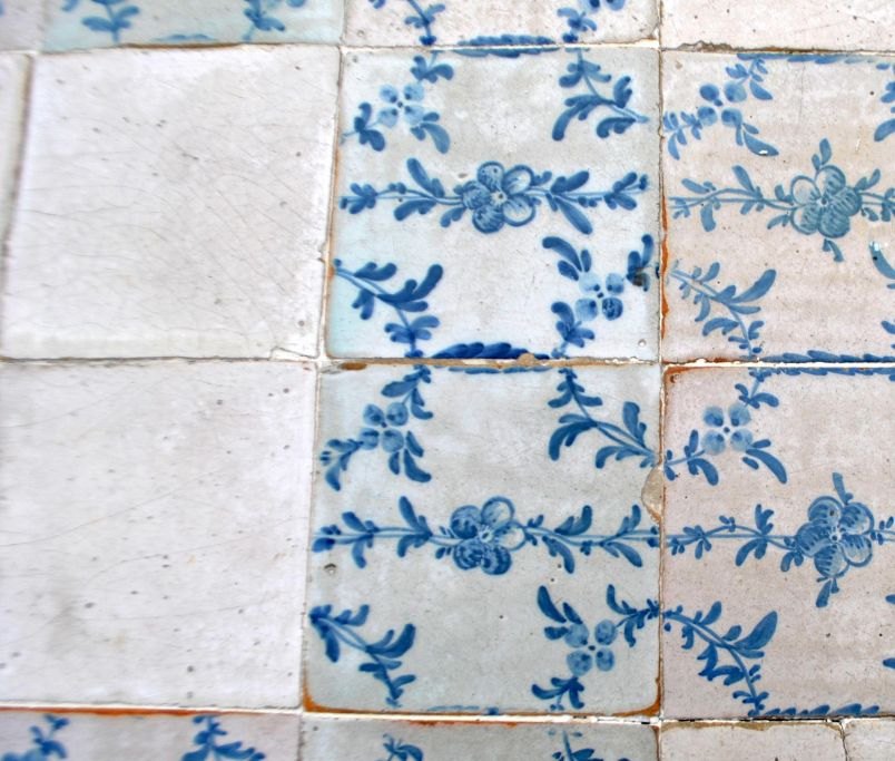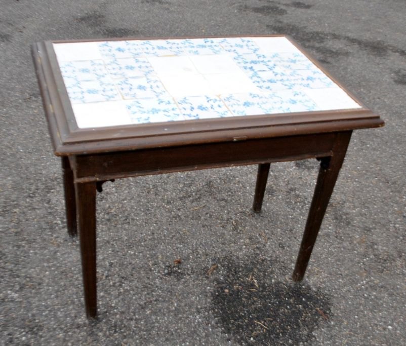 Sjældent originalt brun bemalet flisebord, Louis XVI, 1780, Danmark. Med tilspidsede ben. Med 16 fantastisk sjældne blåmalede ornament fliser med blomster og ranker fra Morsø Fabrikken i mønster. Herudover 8 helt hvide fliser fra samme periode - antagelig fra - København. Det hvide fliser sidder som et firpas i midten og en i hvert hjørne. H.: 70 cm. L.: 89 cm. D.: 62 cm.  Proveniens: En gammel stor bindingsværksgård i Hårmark på Samsø. Bordet fremstår originalt - dog med restaureringer, bl.a. med beslag på kanten. Oprindelig har der været en skuffe i den ene ende og udtrækkelige bakker i hver sin ende. De 4 hvide fliser i hjørnene er med defekter.