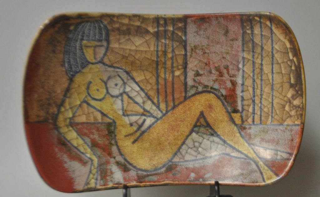 Michael Andersen faience dish, 5696/1, 20th century. Bornholm, Denmark. Decoration in the form of a lying naked woman. Hand painted. Polychrome decorated. Stamped. 24 x 16 cm.