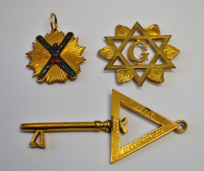 Lot frimurer tegn, 20. årh. 3 stk. Forgyldt messing/bronce. Bl.a. fra Frankrig, Scotland og Sverige.