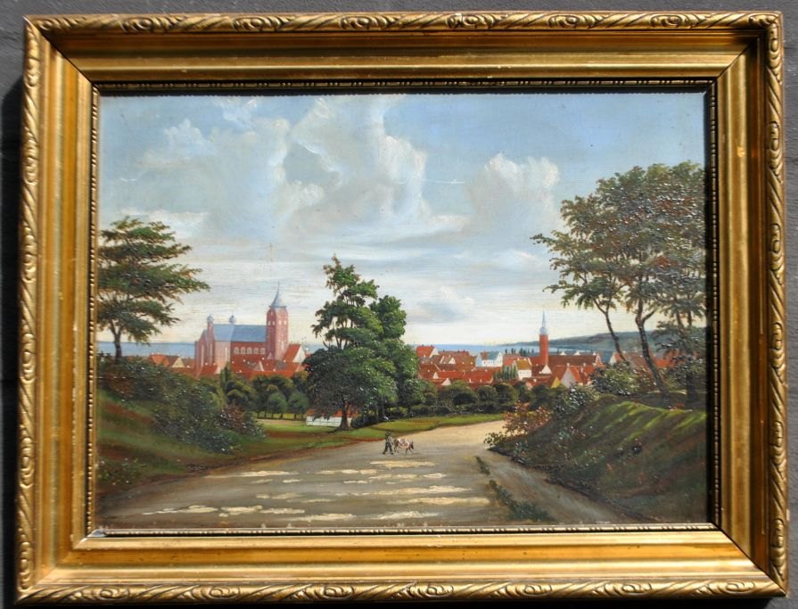 Holm, Peter (1798 - 1875) Danmark: Aarhus set mod syd med Domkirken og Klosterkirken. Olie på metalplade. Usigneret. 25 x 35 cm.  Indrammet: 32 x 42 cm.  Byen er her set fra Munkegade inden porten til byen. Kunstneren har lavet rigtig mange prospekter over Aarhus, men så vidt vides, er dette værk det eneste med dette motiv! NB: Der ydes ingen rabat på dette lot!