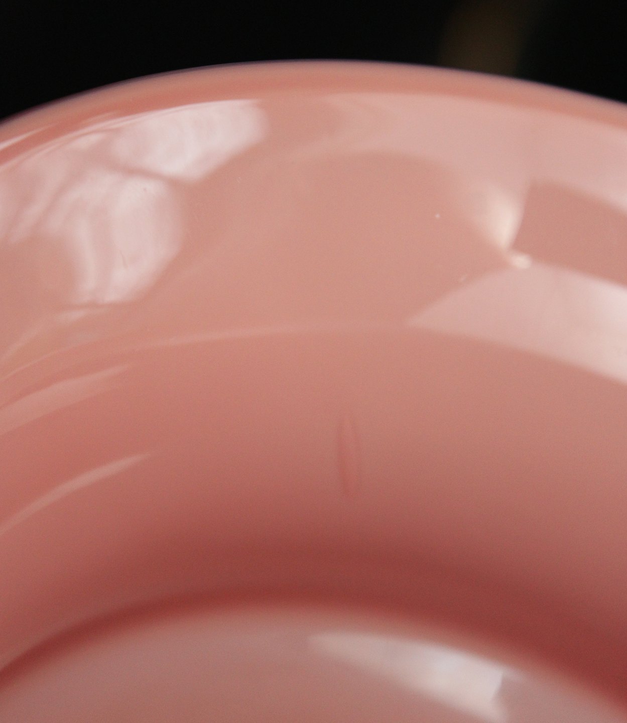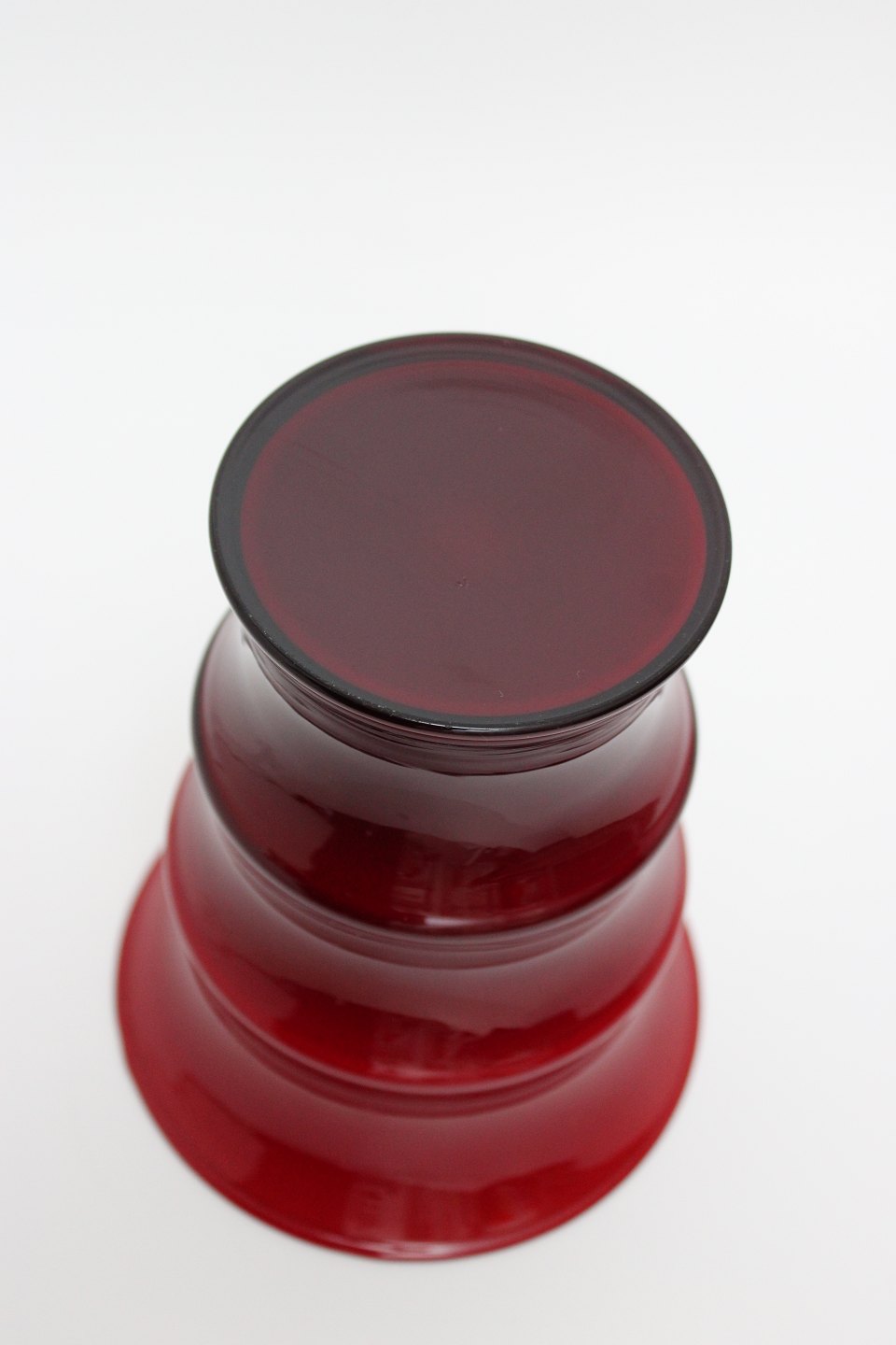 Holmegaard, Karen Blixen rød vase, støvet rosa indvendig. Designet af Anja Kjær fra 2000. Ikke signeret. Vasens form er inspireret af afrikanske kvinders hals og armringe. II. sortering, produktionsfejl indvendig i vasen. Højde 17 cm. Diameter 14 cm. Pris: 275 kr.