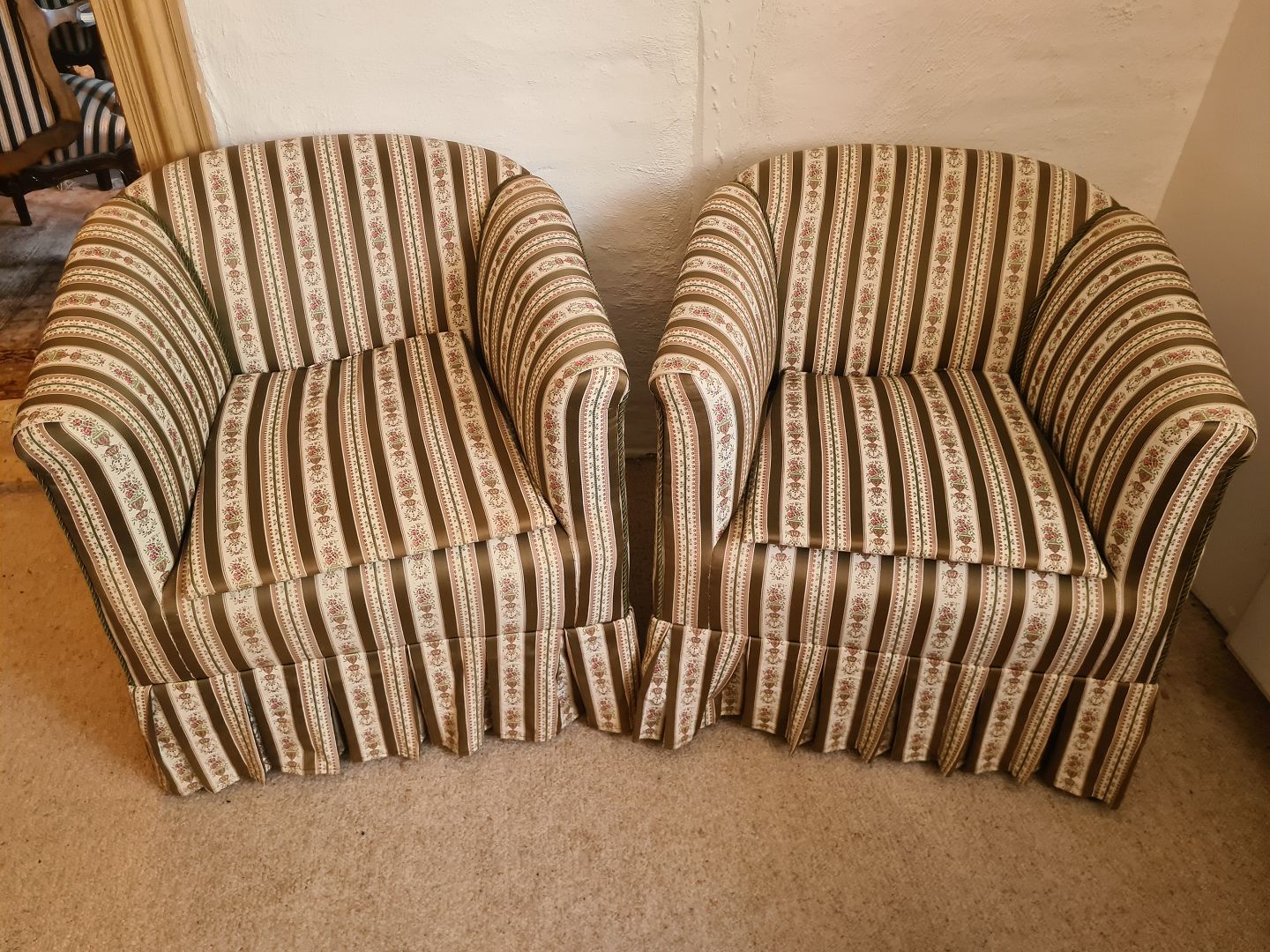 Par overpolstrede lænestole fra 1950'erne. Fremstår pæne og velholdte uden nævneværdige brugsspor.