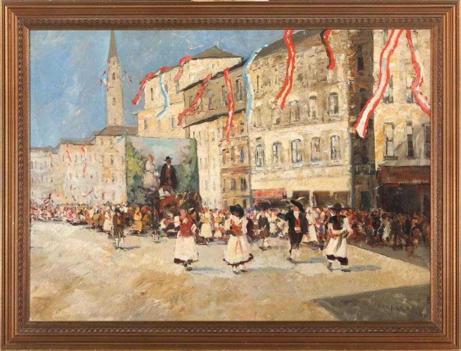 Ruzicka-Lautenschläger, Hans (1862 - 1933) Østrig: Menneskeoptog på Neuer Markt, Wien. Olie på lærred. Signeret. 58 x 79 cm.