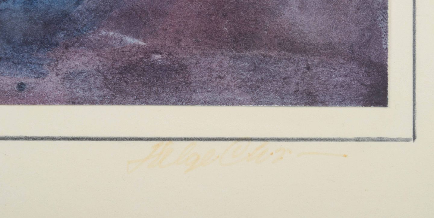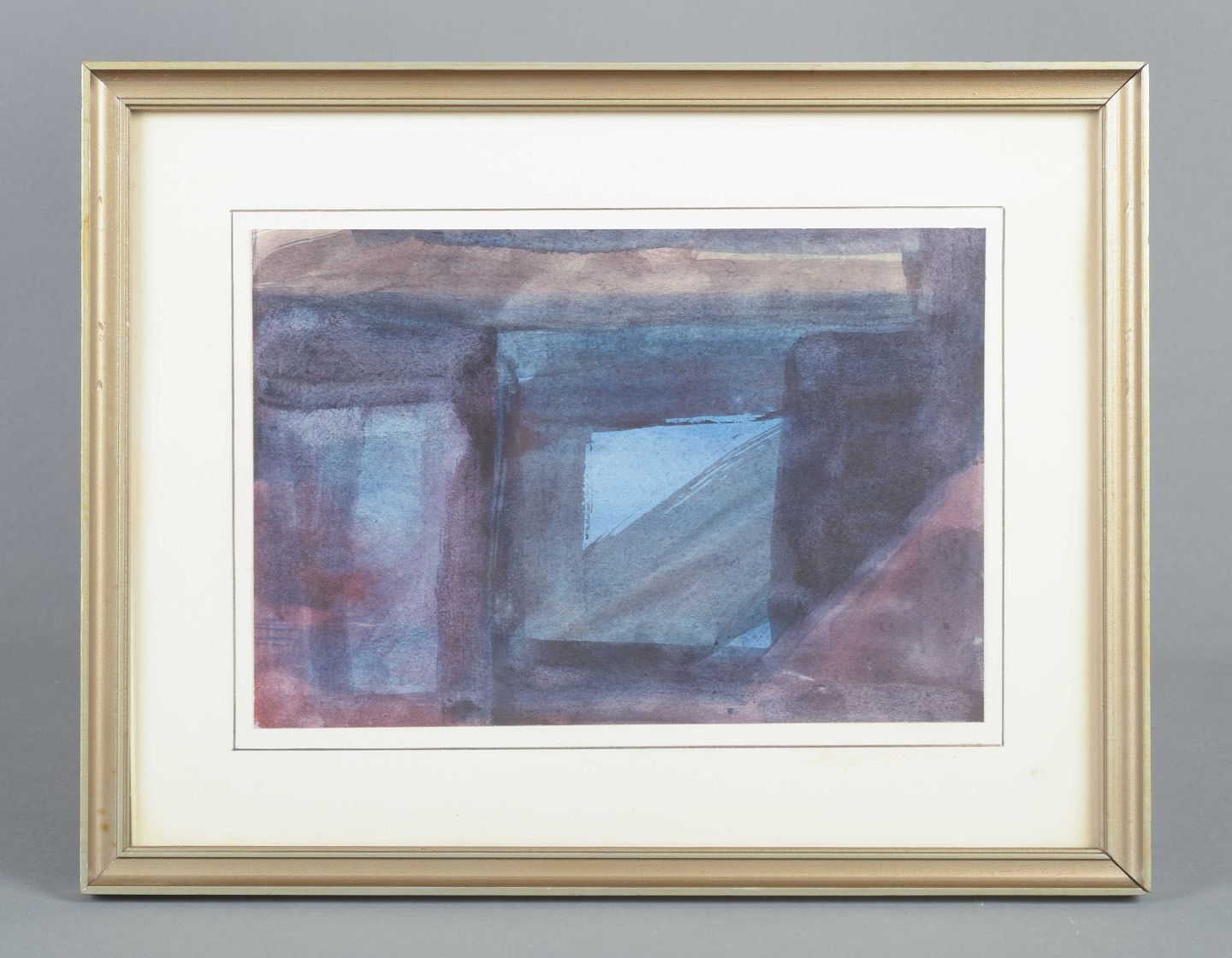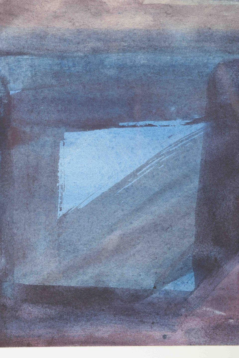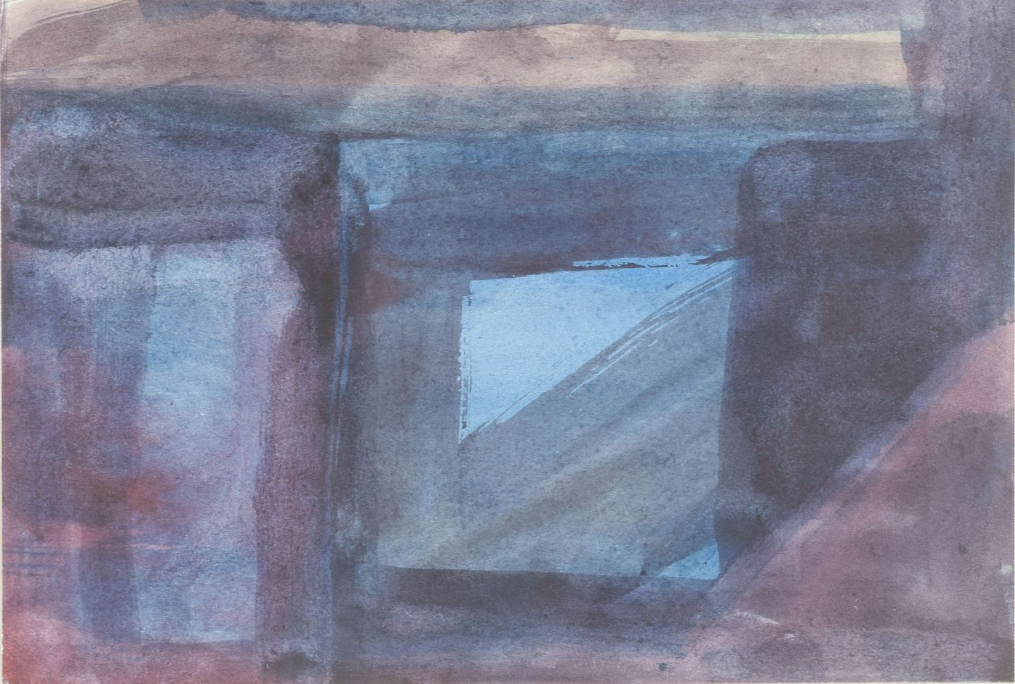 En koloristisk abstraktion af Helge Christiansen, hvor dybe blå og violette toner skaber en geometrisk opdeling af billedfladen. Det centrale felt i lysere blå åbner kompositionen og giver værket en næsten arkitektonisk karakter. Christiansens akvarel afspejler den danske efterkrigsmodernismes interesse for farveflader og rumlige relationer.
