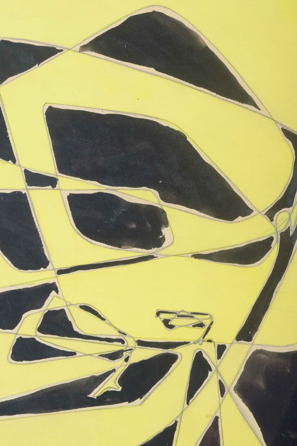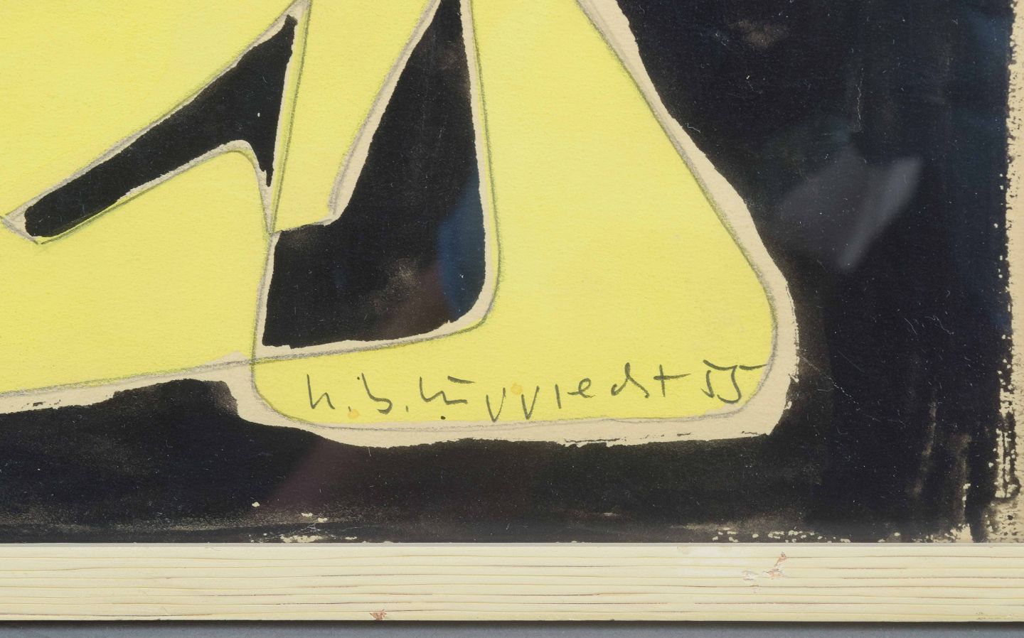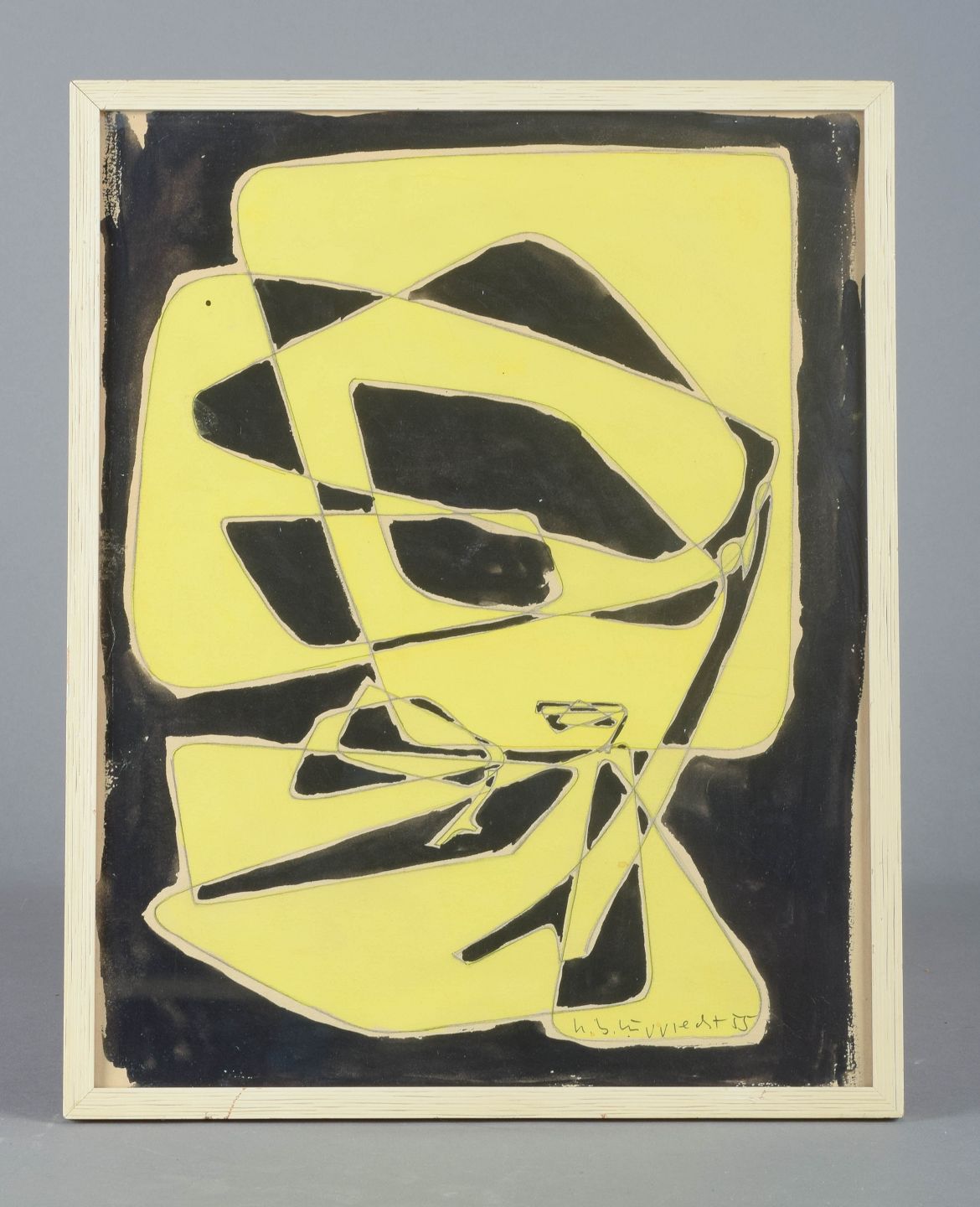 Et ekspressivt abstrakt værk udført i 1955 med stærke kontraster mellem sort og gult. De dynamiske former skaber en rytmisk og næsten musikalsk komposition, hvor linjerne opdeler fladen i geometriske fragmenter. Farvernes intensitet og kontrast giver billedet et energisk og dramatisk udtryk.
