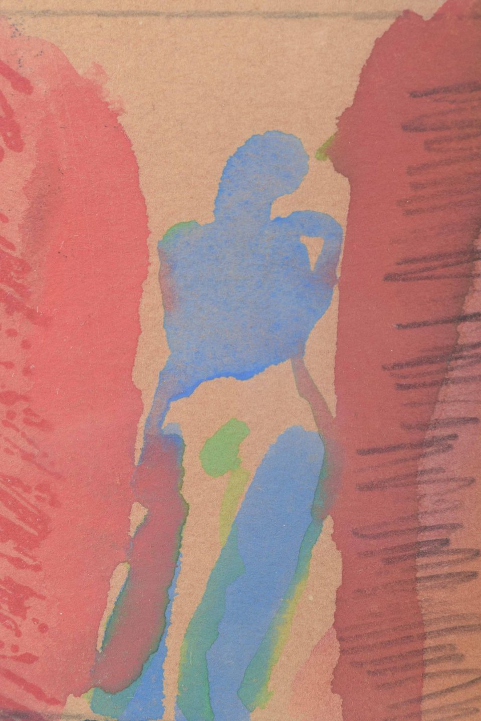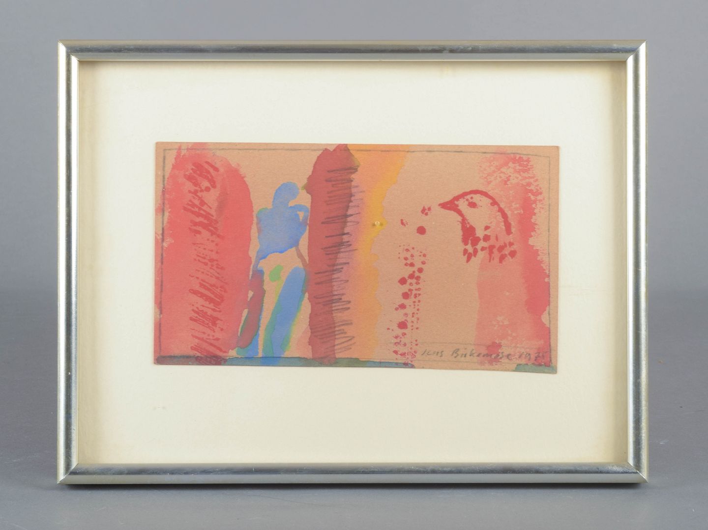 Et farvestærkt og drømmende motiv, hvor figurative antydninger og abstrakte former smelter sammen. Værket balancerer mellem spontanitet og kontrol: blå og grønne penselstrøg synes at danne menneskelige skikkelser, mens røde og rosa toner åbner billedfladen mod et fuglemotiv i højre side. Den kompositoriske opdeling og det lyriske farvespil gør værket til et karakteristisk eksempel på Birkemoses billedsprog fra midten af 1970’erne.
