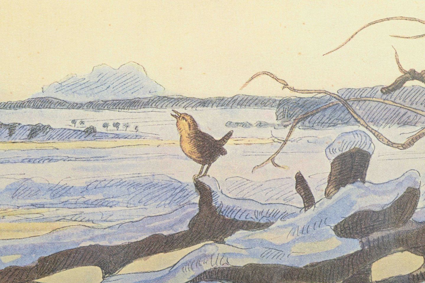 Et stemningsfuldt vintermotiv af Johannes Larsen, der skildrer den kølige decembermorgen med sneklædte grene, havets horisont og en ensom fugl i forgrunden. Værket fremviser kunstnerens karakteristiske sans for naturens stemninger og det enkle, men præcise linjesprog.