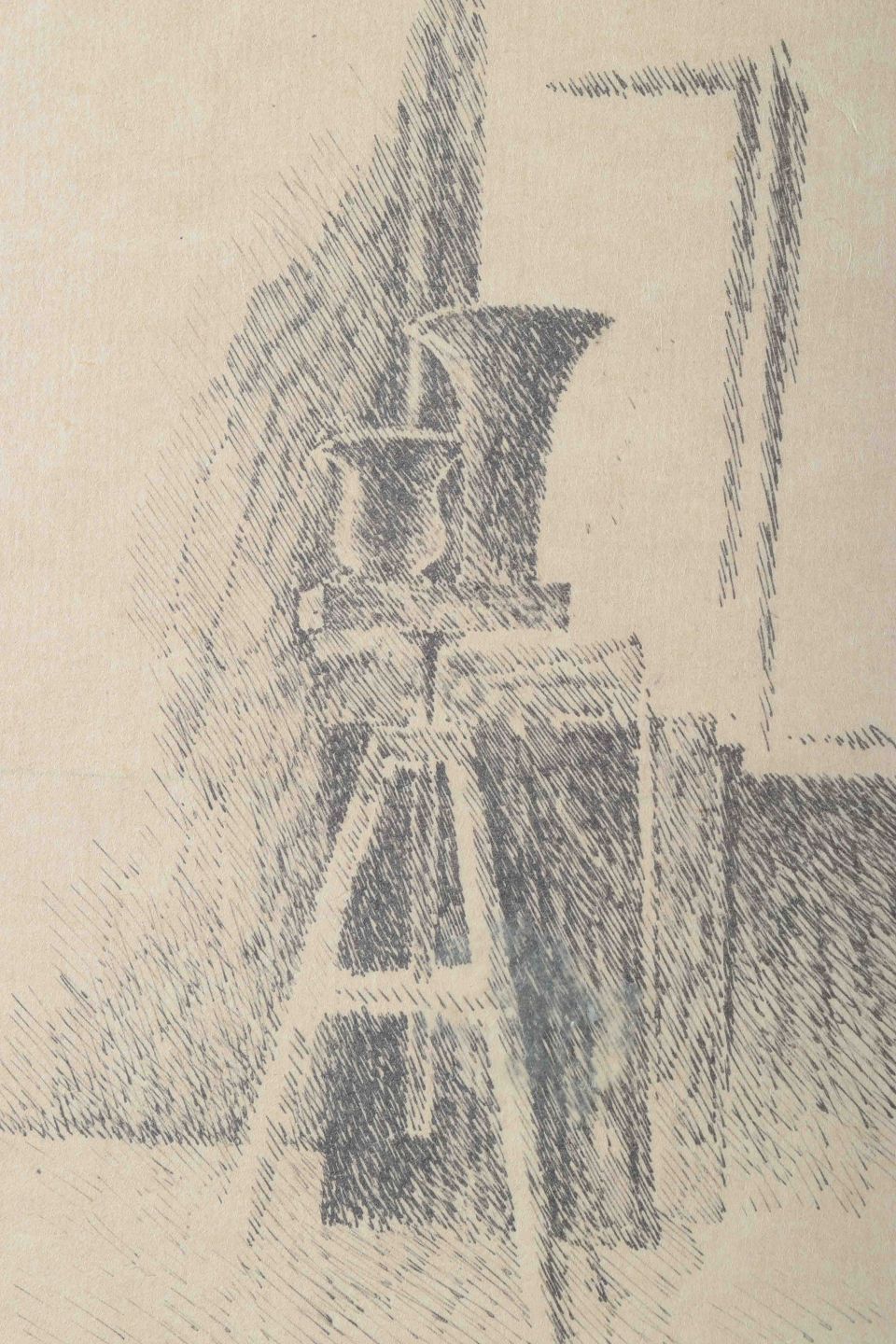 Et stemningsfuldt litografi af Pia Schutzmann, hvor lys og skygge danner et stilfærdigt motiv med forfinede grafiske virkemidler. Værket demonstrerer kunstnerens sans for enkle, poetiske kompositioner og en rolig, præcis streg.
