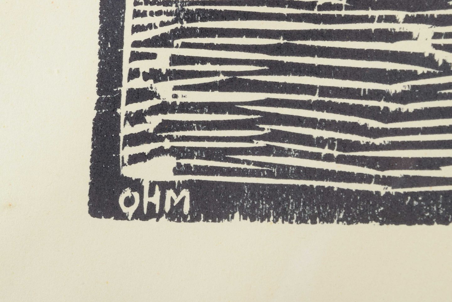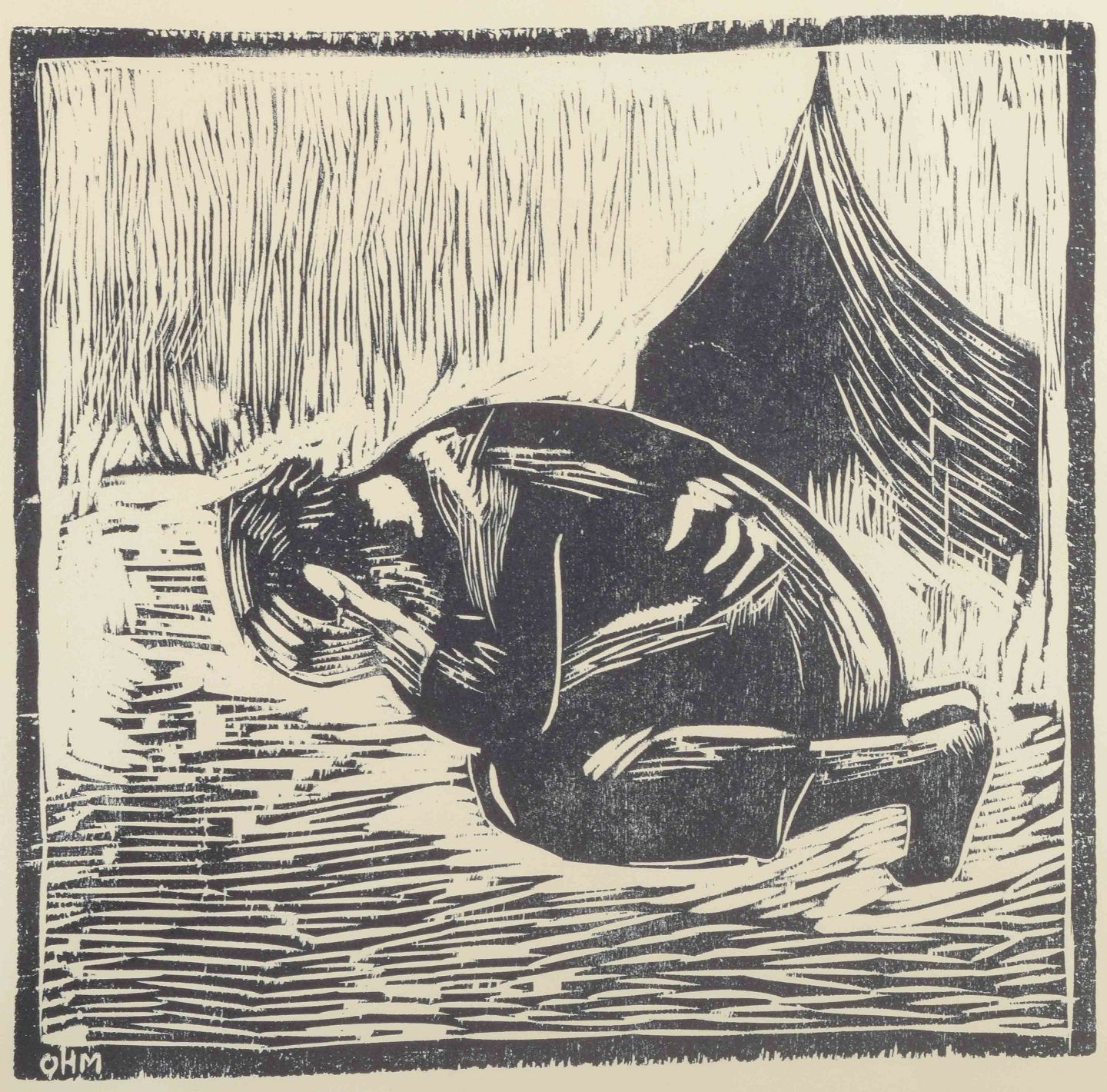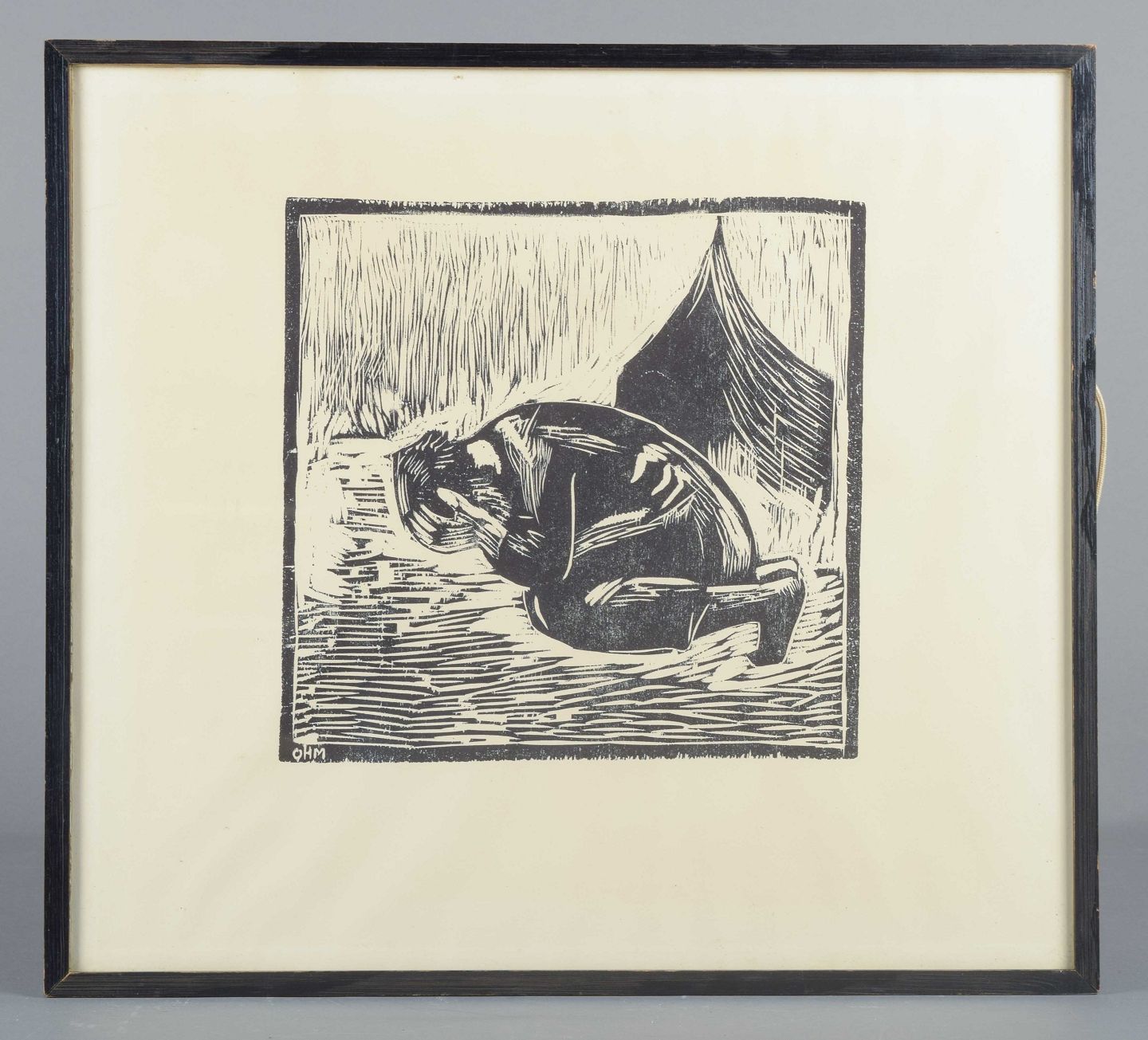 Træsnit med figur i knælende stilling foran telt. Signeret med monogram "OHM".