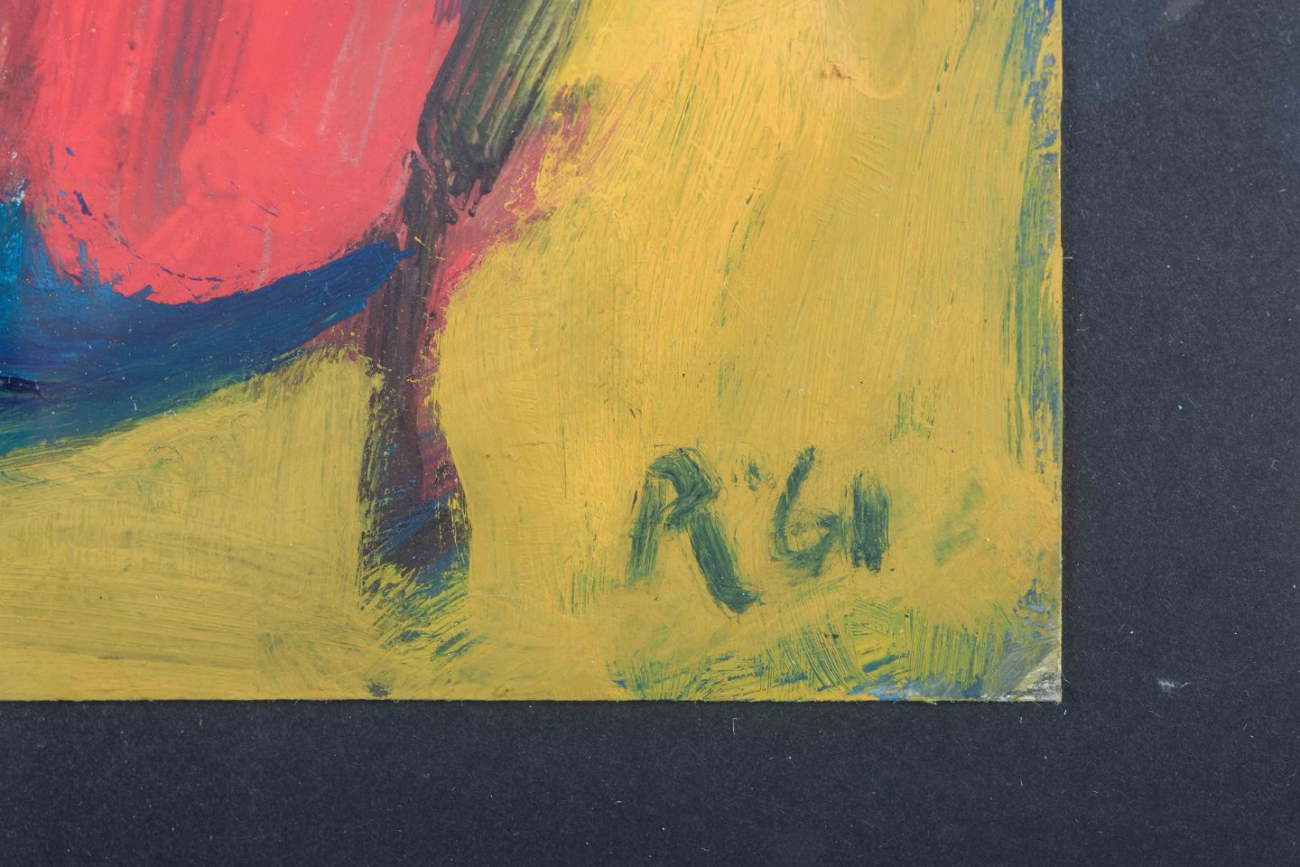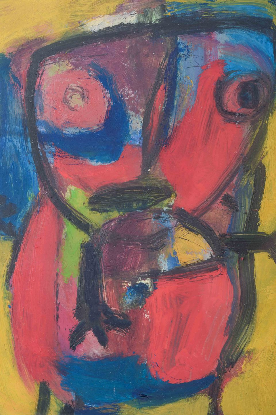 Et kraftfuldt og farvestærkt værk udført i Cobra-traditionen. Maleriet viser to figurative skikkelser, reduceret til primitive og næsten barnlige former, udført i ekspressive penselstrøg med intense farvekontraster i rød, blå, grøn og gul. De spiralformede øjne og de markante konturer understreger det spontane og umiddelbare udtryk, som kendetegner Cobra-kunstnernes oprør mod den etablerede modernisme i efterkrigstiden.