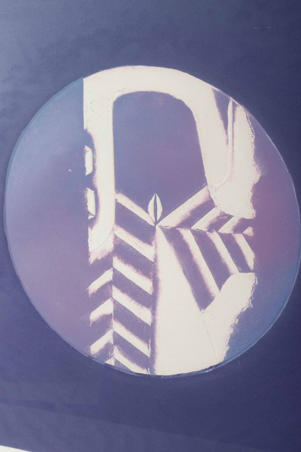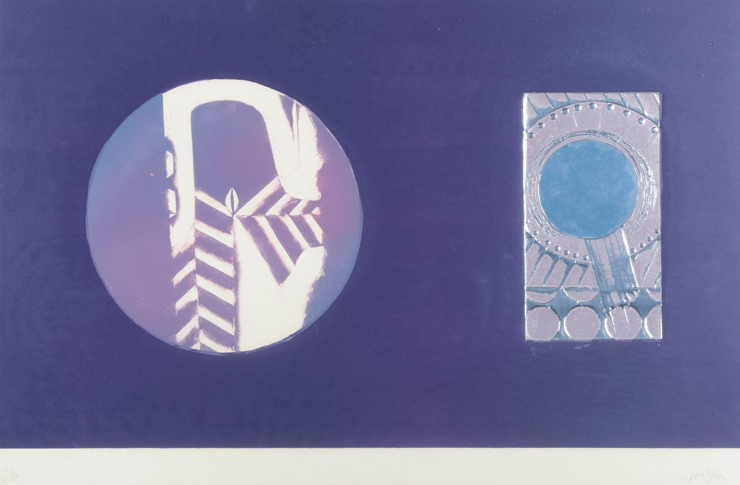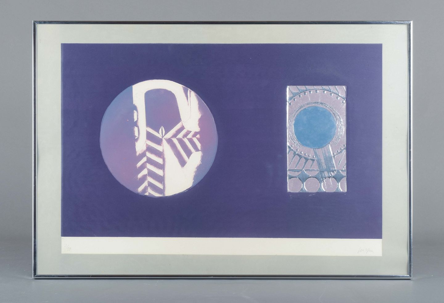 Et karakteristisk grafisk arbejde af Gino Scarpa, hvor geometriske former og kontrasterende farver kombineres med bladsølv, hvilket skaber en poetisk balance mellem abstraktion og symbolik