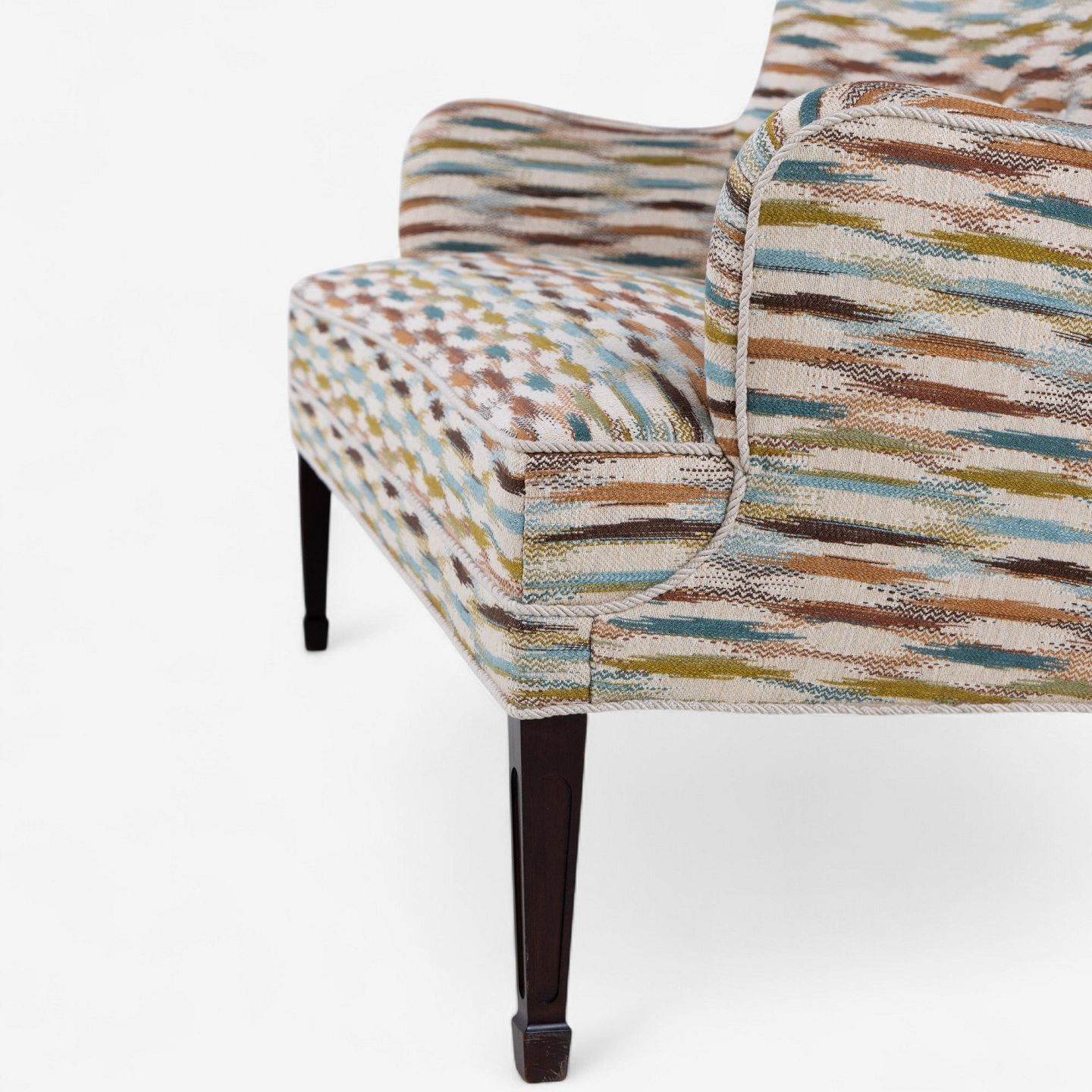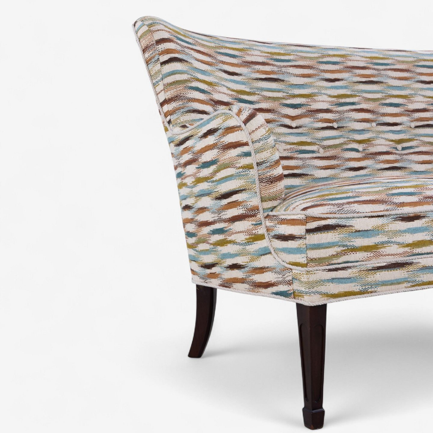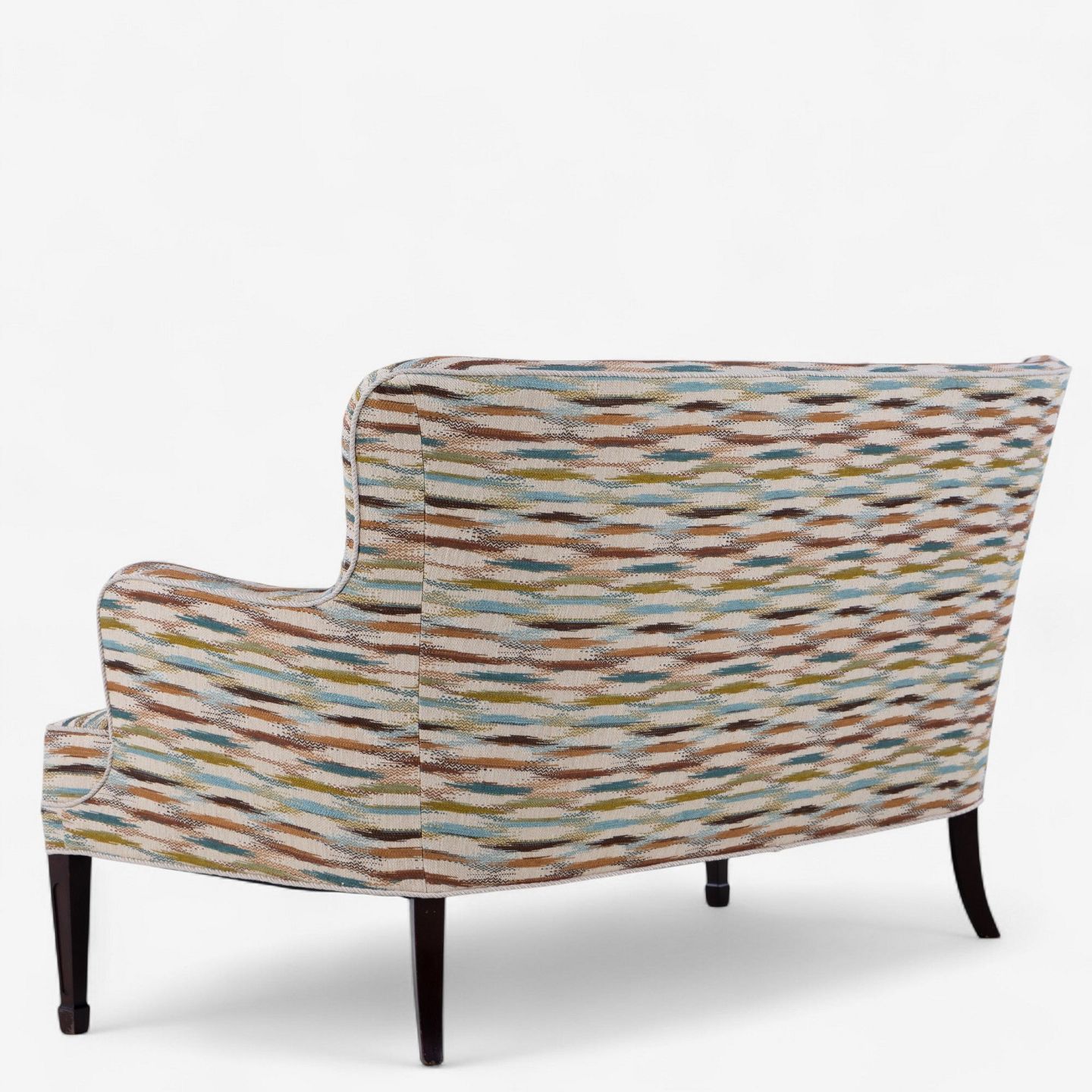 Sofa upholstered in Felbrigg - Teal/Chestnut and legs in dark stained mahogany.