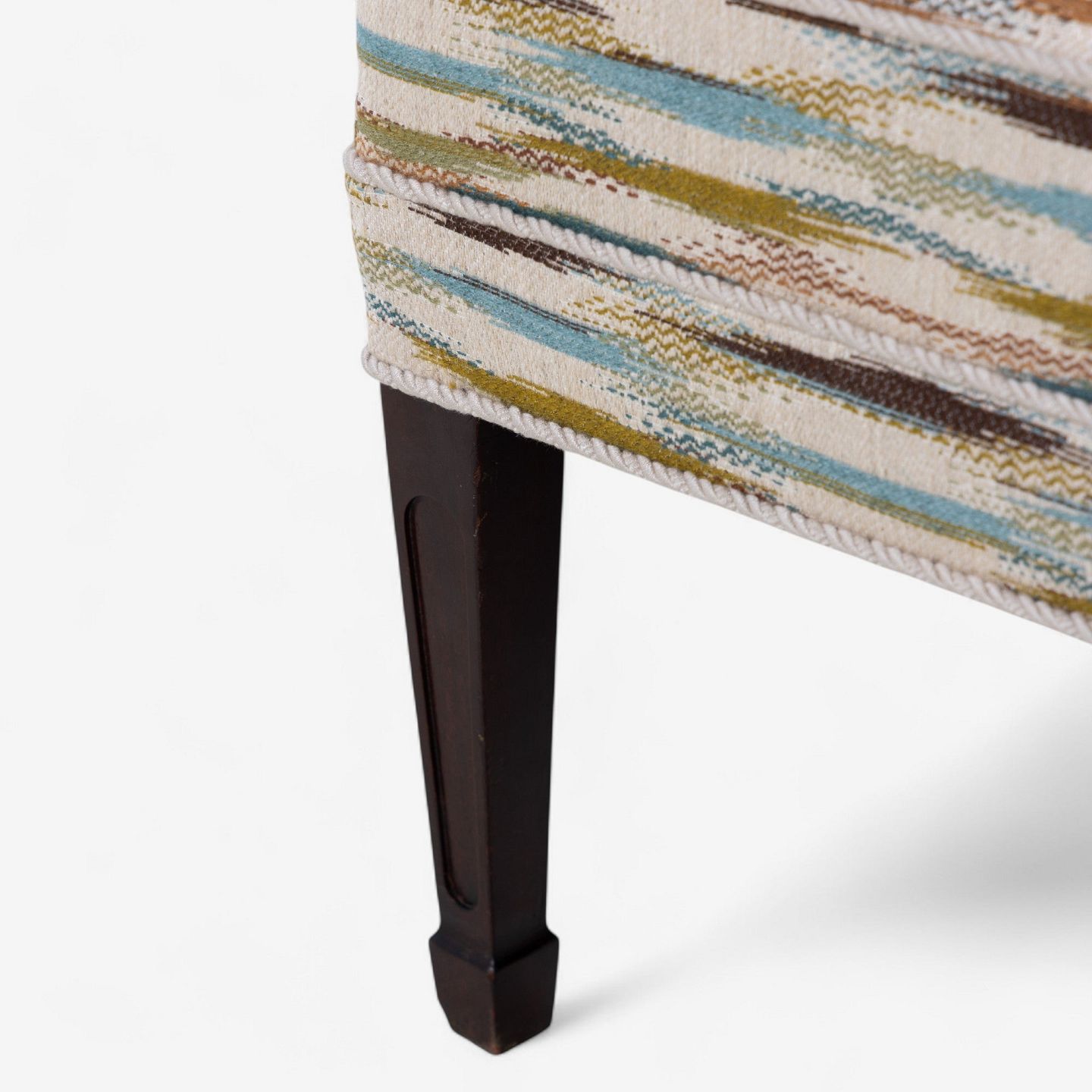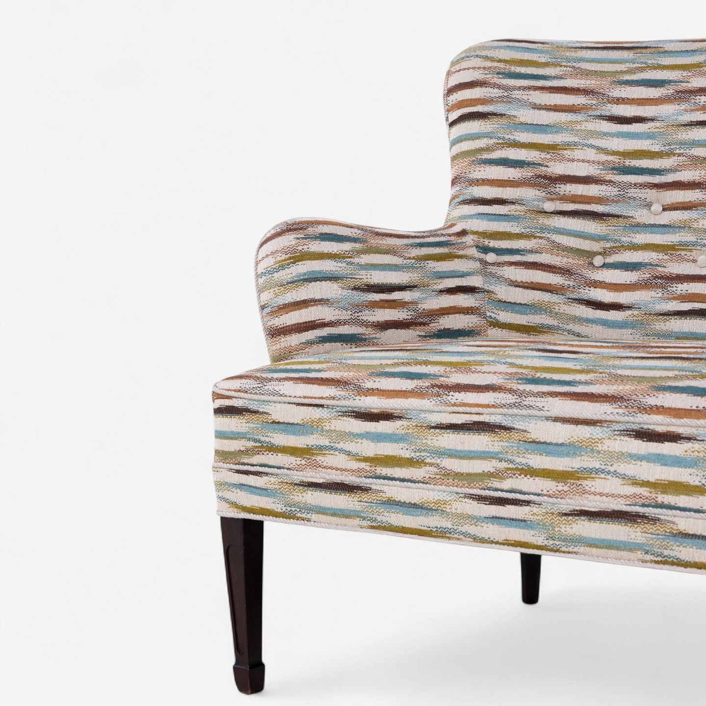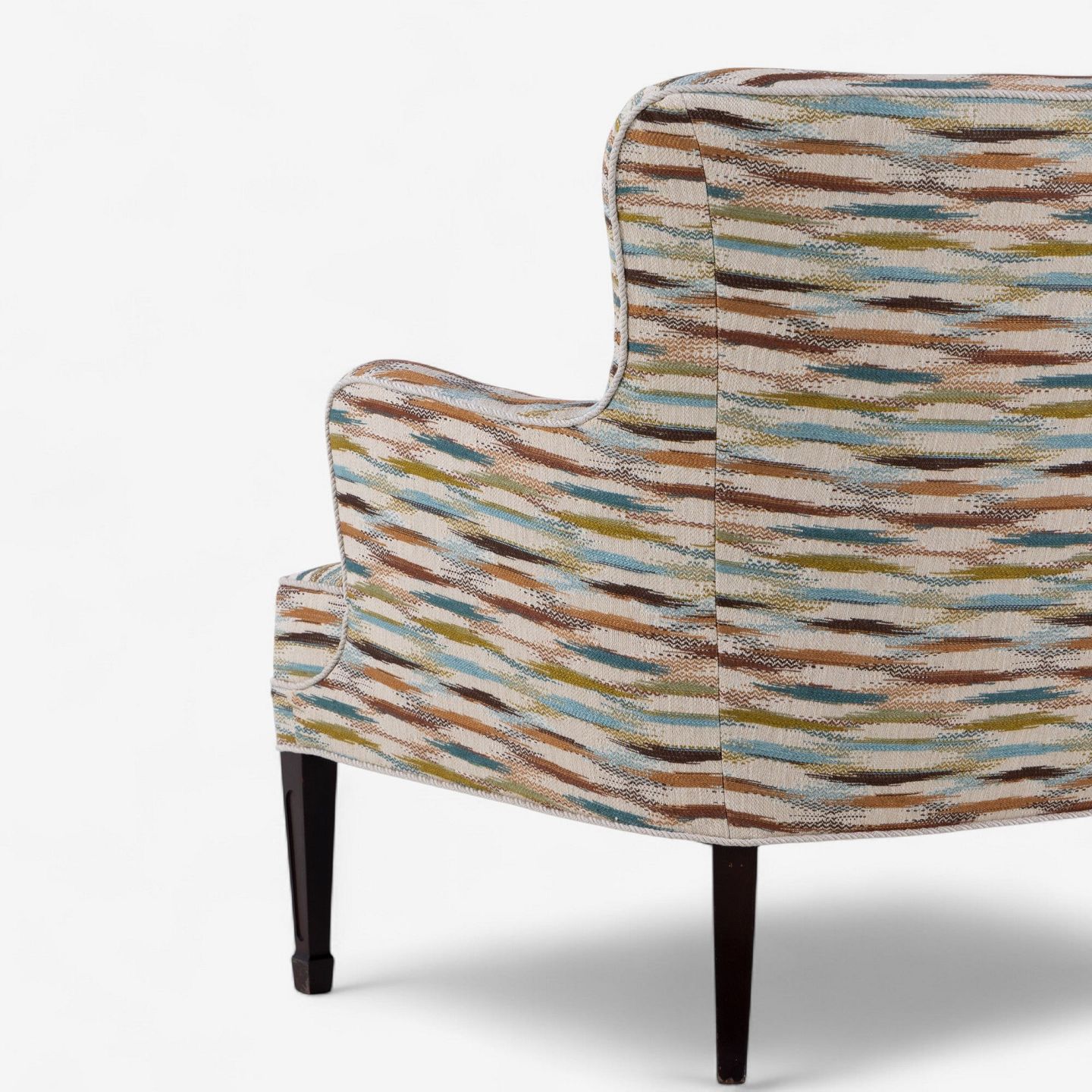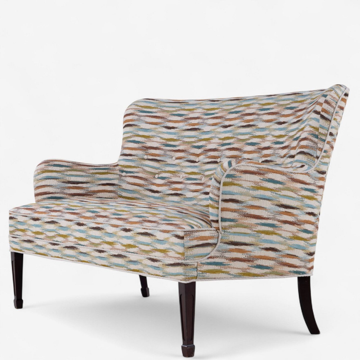 Sofa upholstered in Felbrigg - Teal/Chestnut and legs in dark stained mahogany.