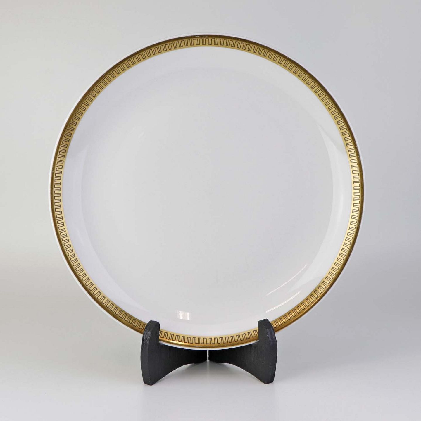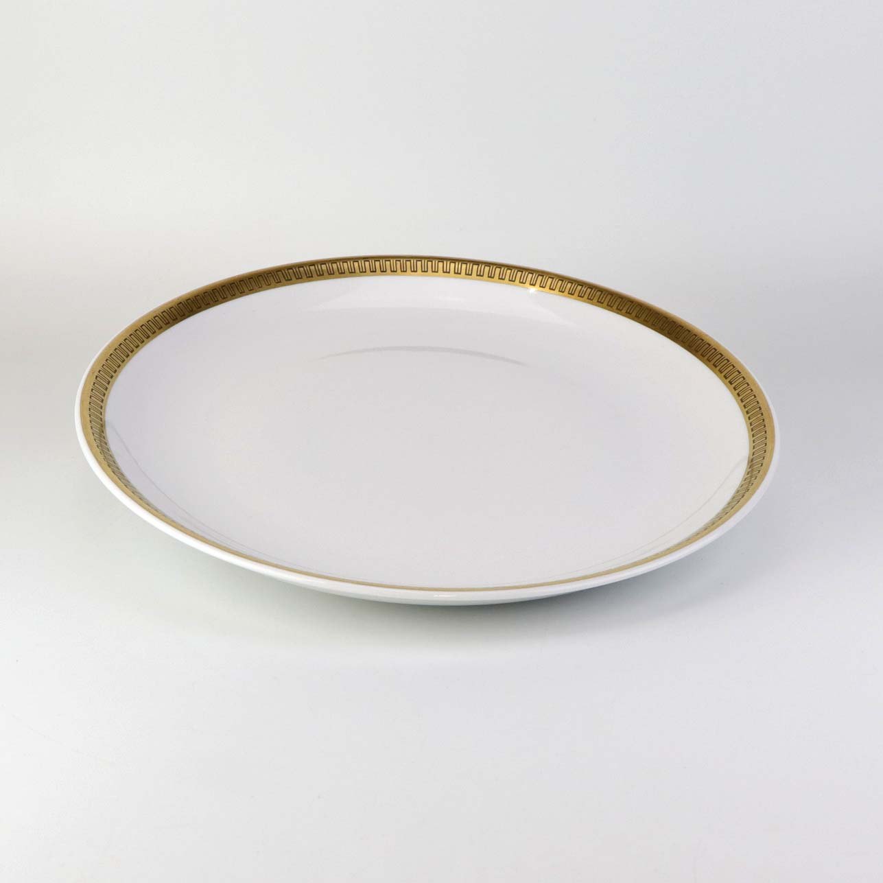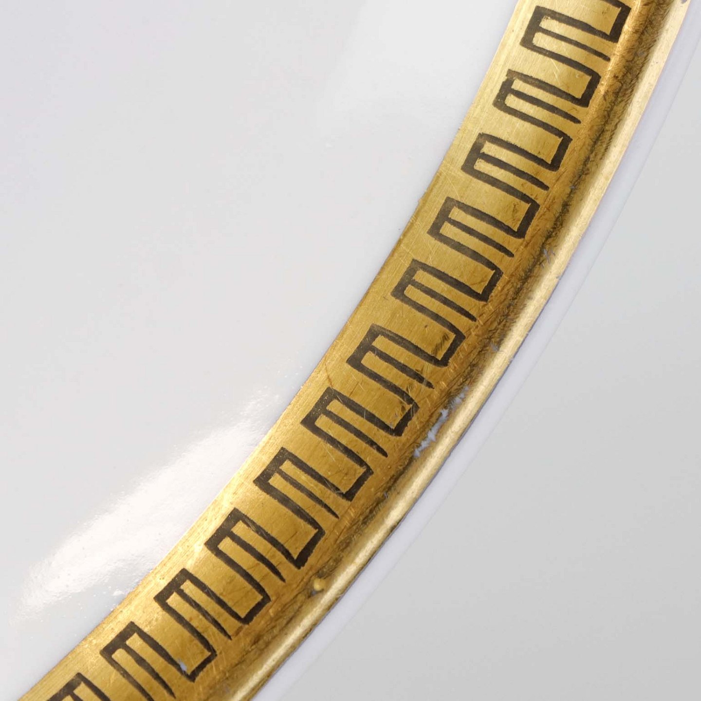 Stel i glat hvidt porcelæn dekoreret med sort streg i guldbort.