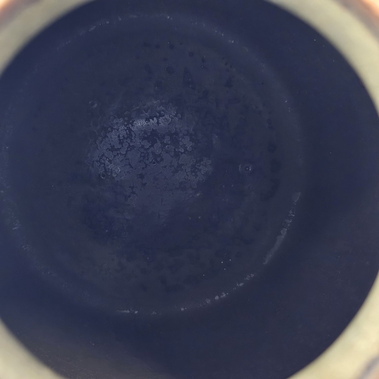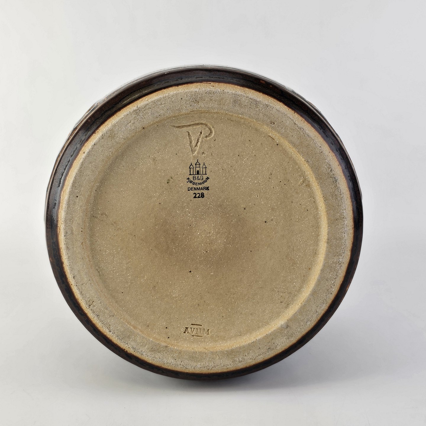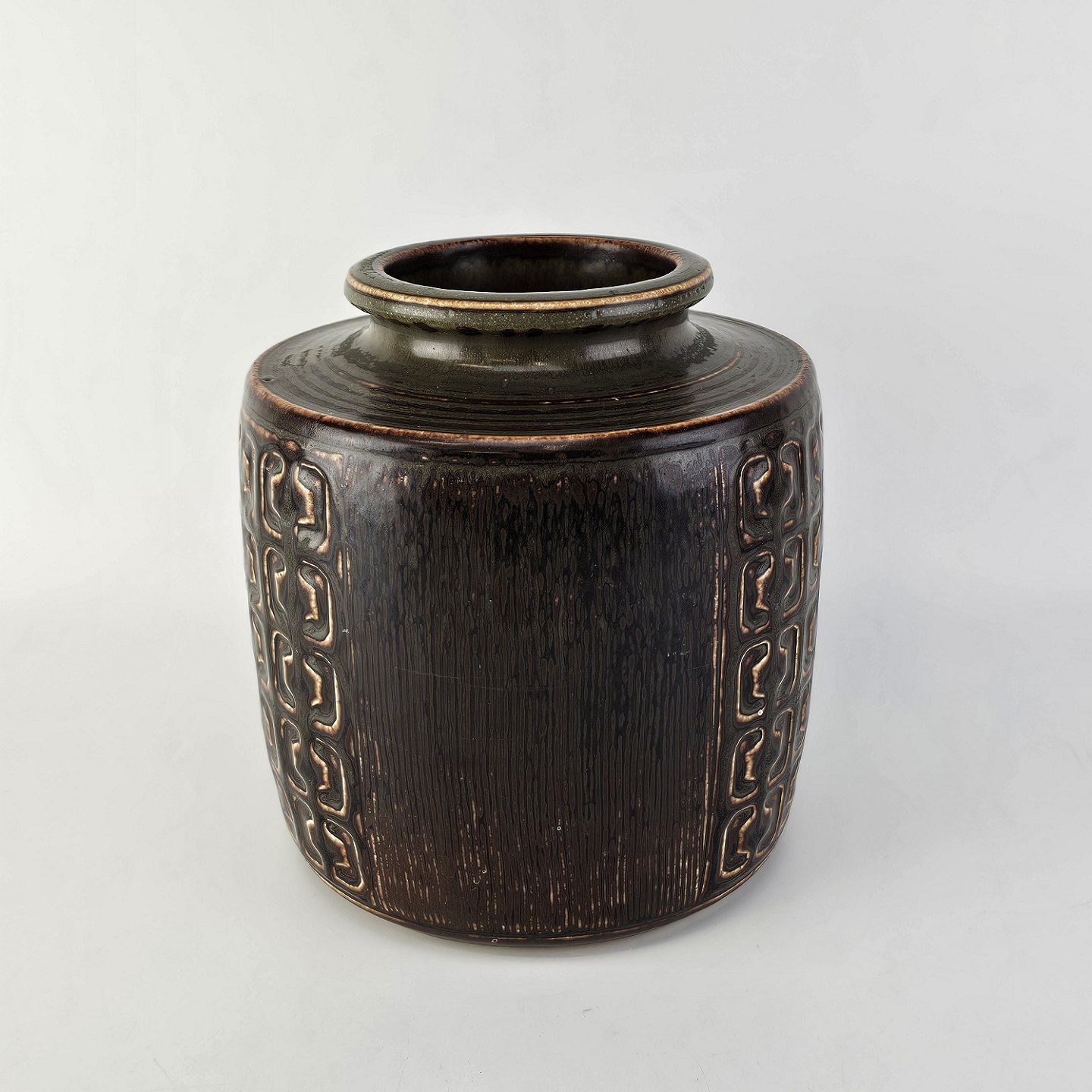 Vase i stentøj med riller og abstrakt mønster i brun glasur