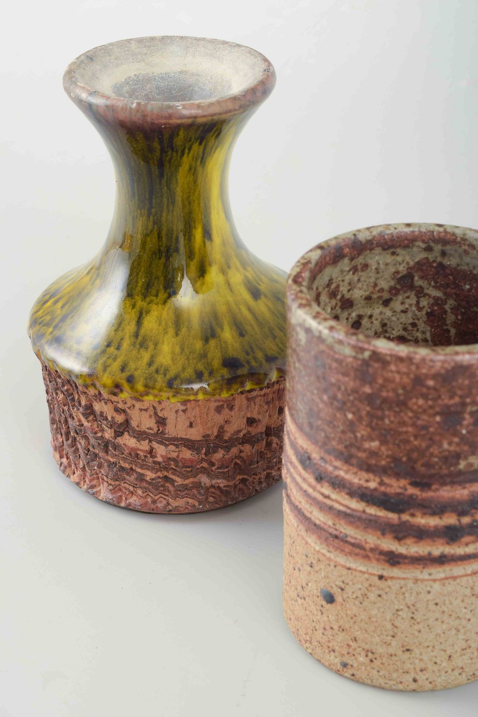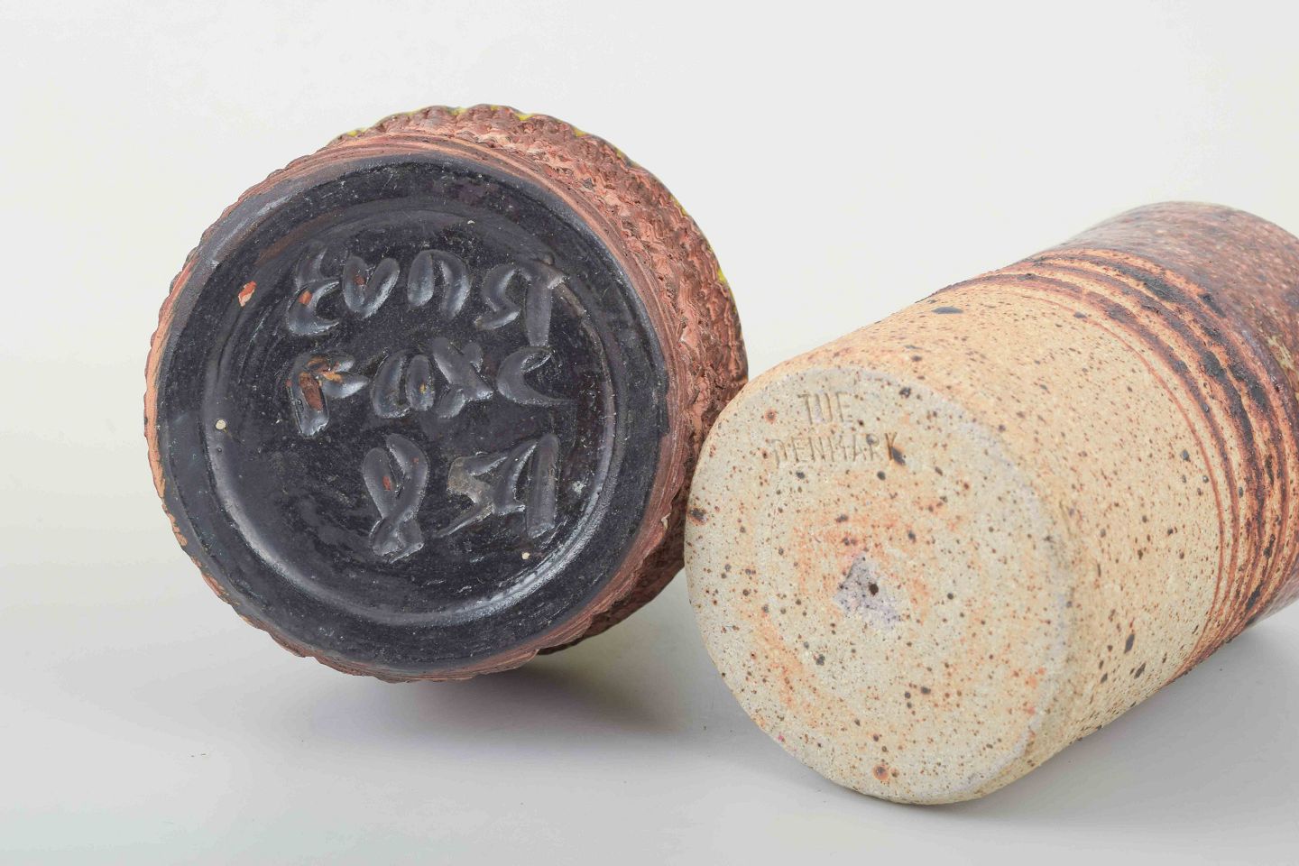 Two small stoneware vases, one cylindrical with incised signature “Ernst Faxe” underneath, the other with flared neck and yellow-brown running glaze. Marked "Tue"